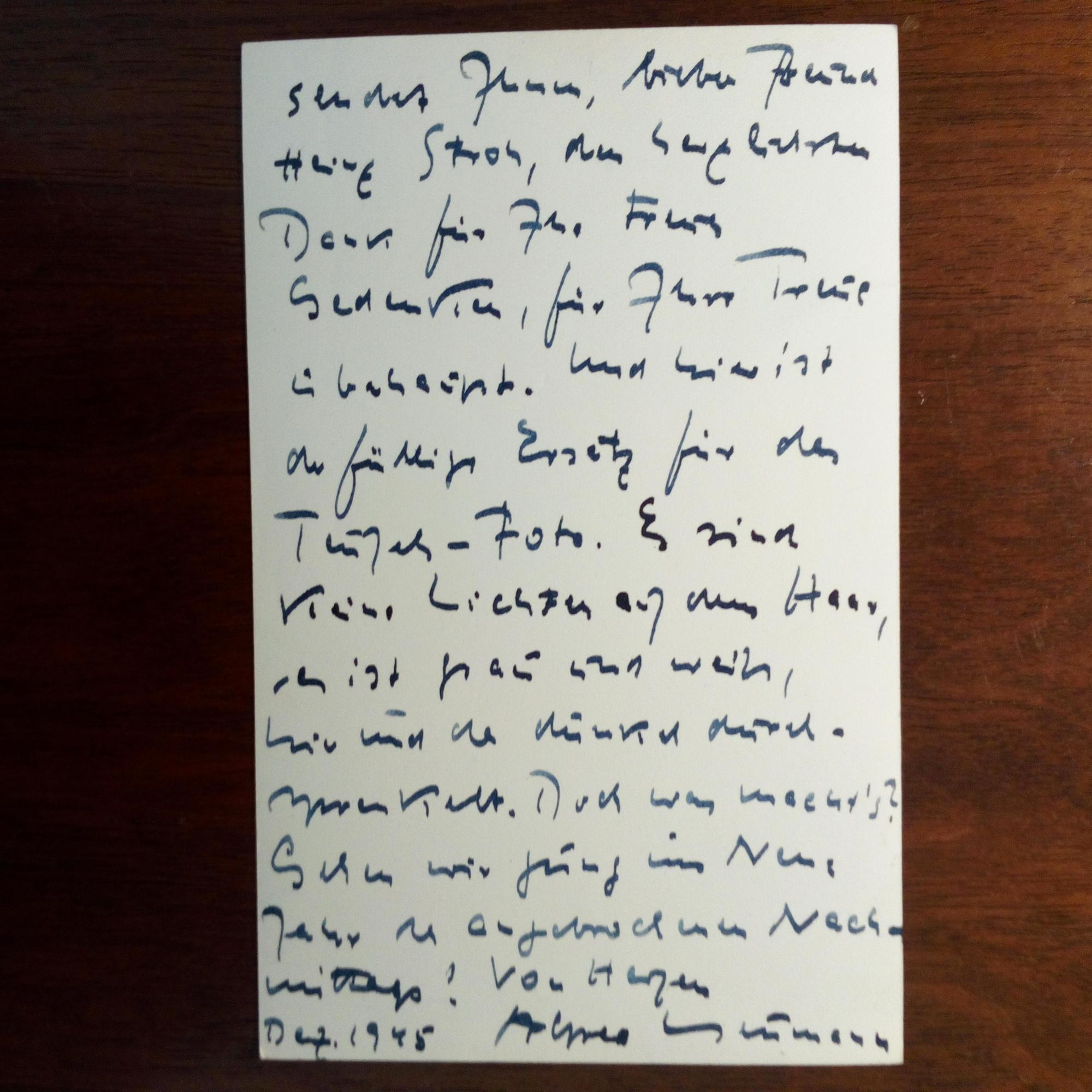 1895-1952, Schriftsteller - Pfo. als e. postal. Briefkarte, (Los Angeles) Dez. 1945. Bedankt sich für Wünsche zum 50. Geb. Dazu 3 dicht beschr. Briefe, je mit U., 1945/46, einer mit e. Zusatz, zus. ca. 3 ½ S. gr. 8°. An den Schriftsteller und Leiter des Desch-Verl. in München, Heinz Stroh (1899-1952).: ...Wenn Ihnen jemand helfen kann, in die Staaten zu kommen, so sind es Dieterles...Thomas Mann sehe ich in dieser Woche. Ich glaube nicht, dass er über Deutschland und die Deutschen verfügen kann. Bermann-Fischer ist da so scharf wie eine Kombination aus Erzengel und Höllenhund... u.a.