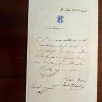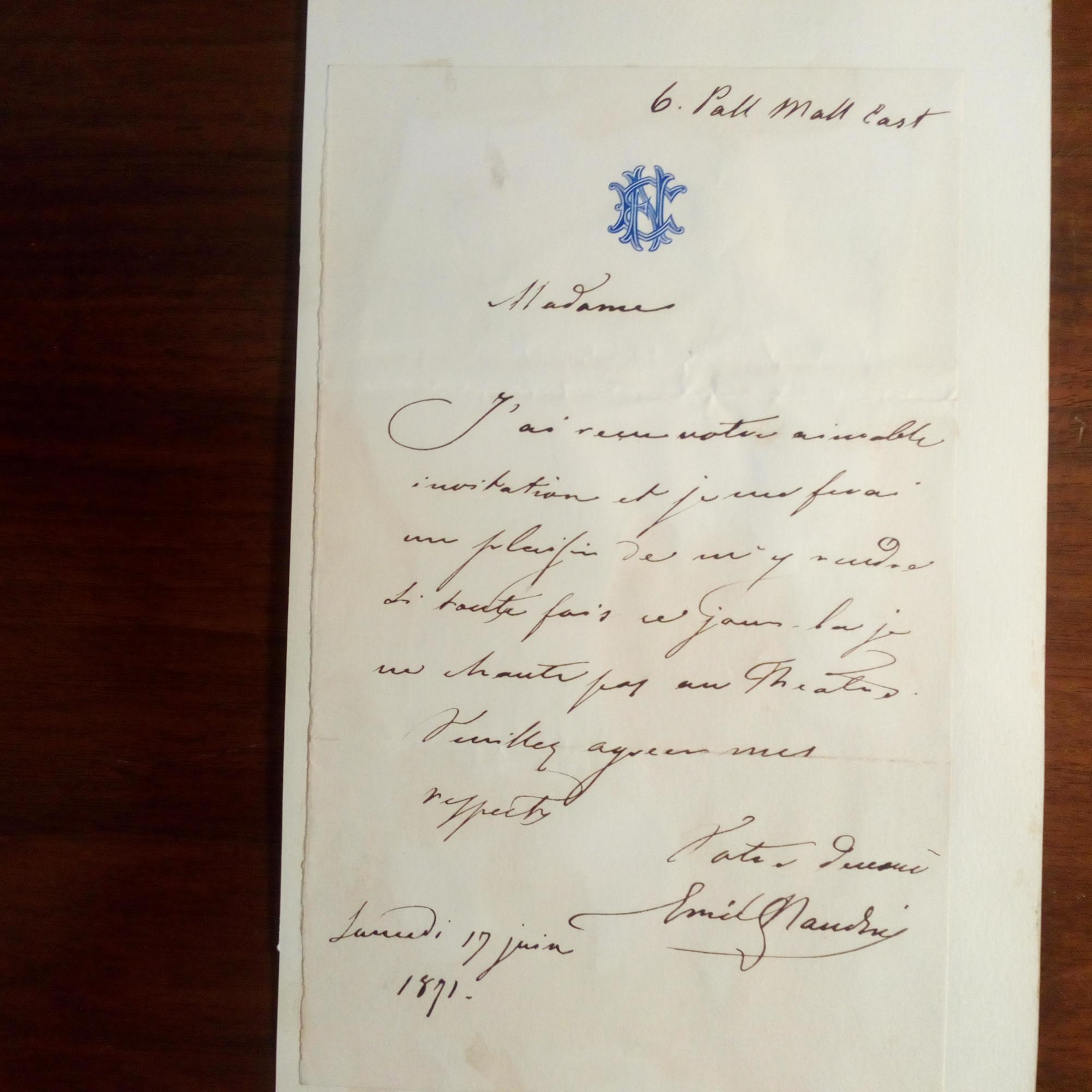1823-90, italien. Sänger (Tenor) - E. Br. m. U., London 17.6.1871, 1 S. 8°, gedr. Emblem, gering knittrig, hinterlegt. Nimmt die Einladung einer Dame an: ...ce jour-la je ne chante au Theatre...