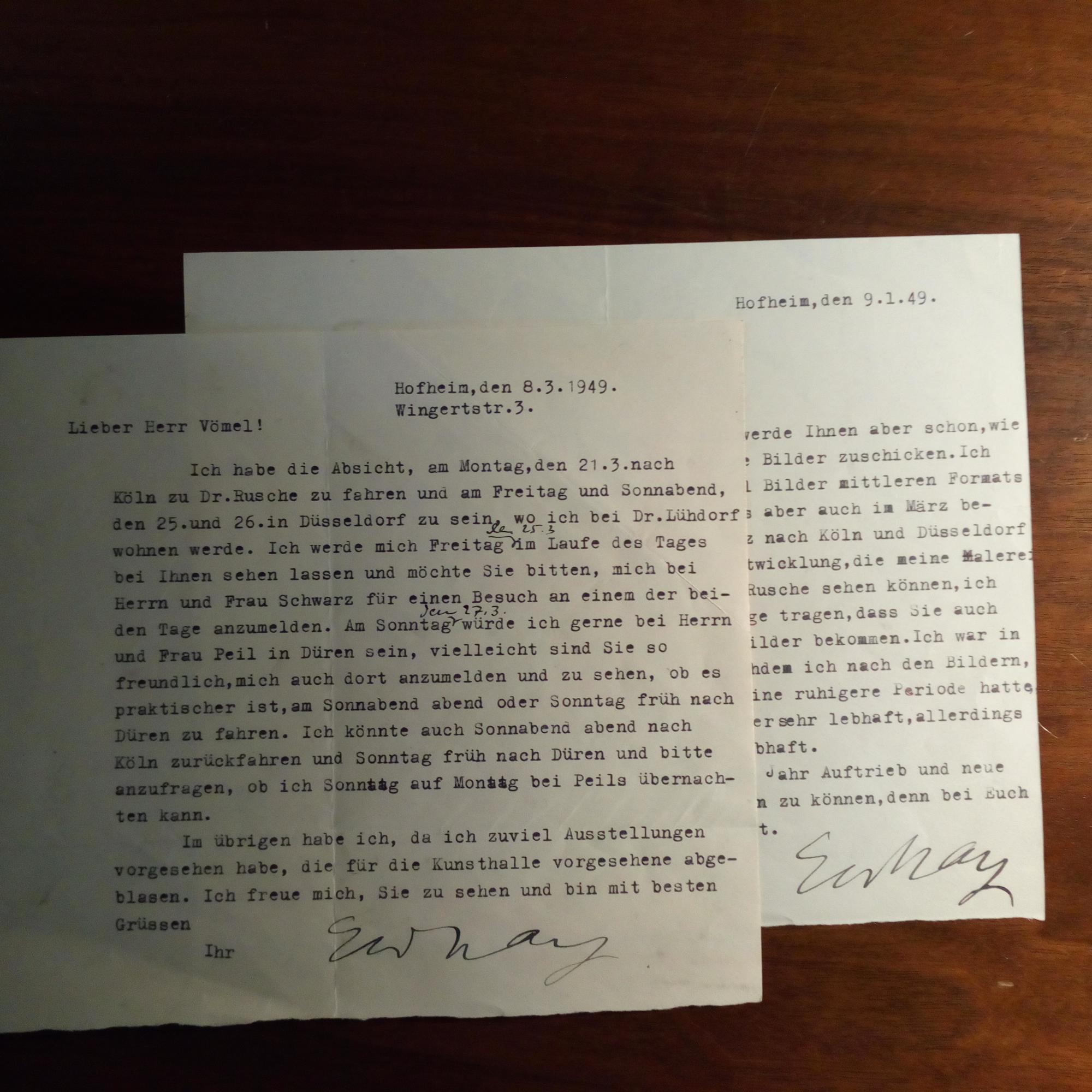 1902-68, Maler - 2 Briefe mit U., Hofheim Anfang 1949, je 1 S. 8° quer, gel. An den Galeristen Alexander Vömel (1897-1985) in Düsseldorf betr. einer bevorstehenden Ausstellung und Details zu einem Besuch derselben. ...Sie werden die rapide Entwicklung, die meine Malerei genommen hat, im März schon bei Rusche sehen können...