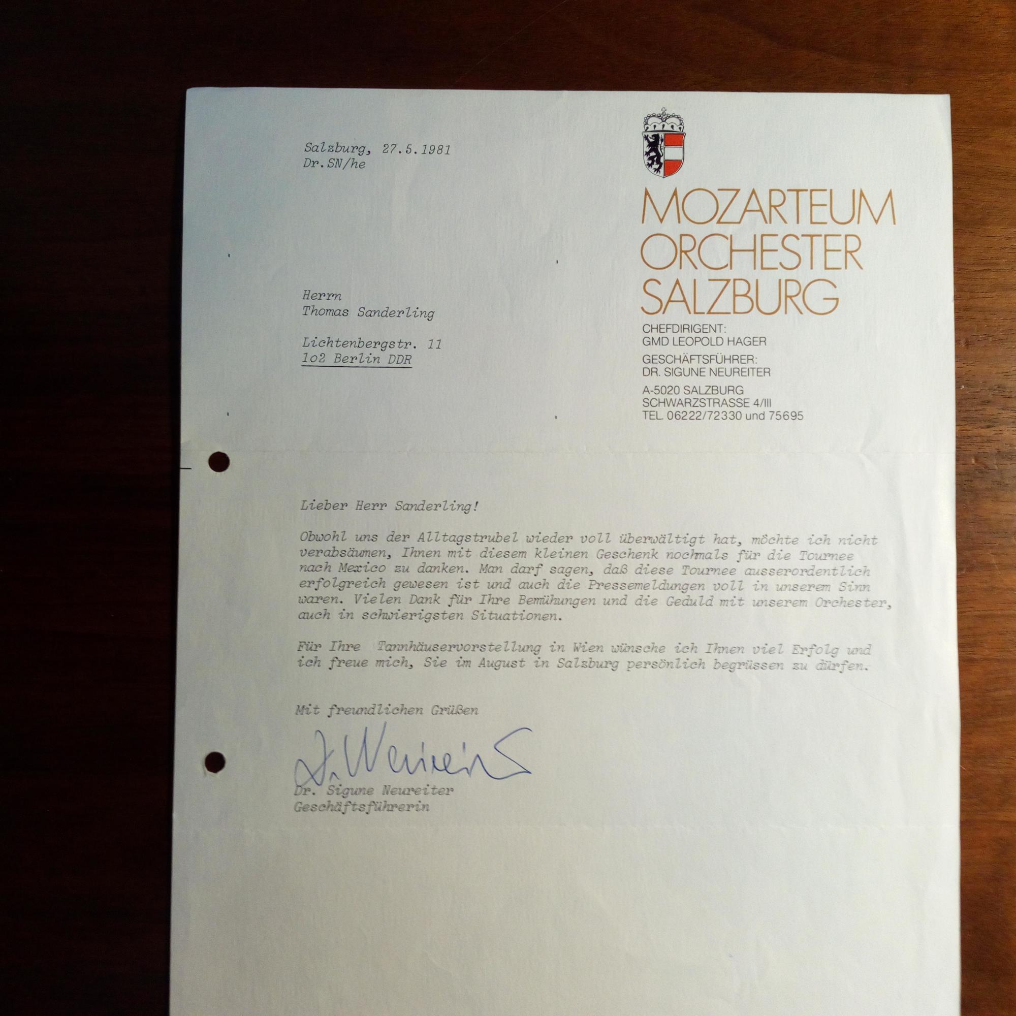 1932-2017, österr. Politikerin (ÖVP), Gesch.führerin des Mozarteum-Orchesters in Salzburg - Brief mit U., Salzburg 27.5.1981, ¾ S. 4°, Br.kopf des Mozarteums. An den Dirigenten Thomas Sonderling (geb. 1942): Dankt mit einem Geschenk für "die Tournee nach Mexico": ...Mann darf sagen, daß diese Tournee ausserordentlich erfolgreich gewesen ist...Für Ihre Thannhäuservorstellung in Wien wünsche ich Ihnen viel Erfolg...