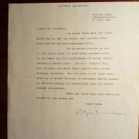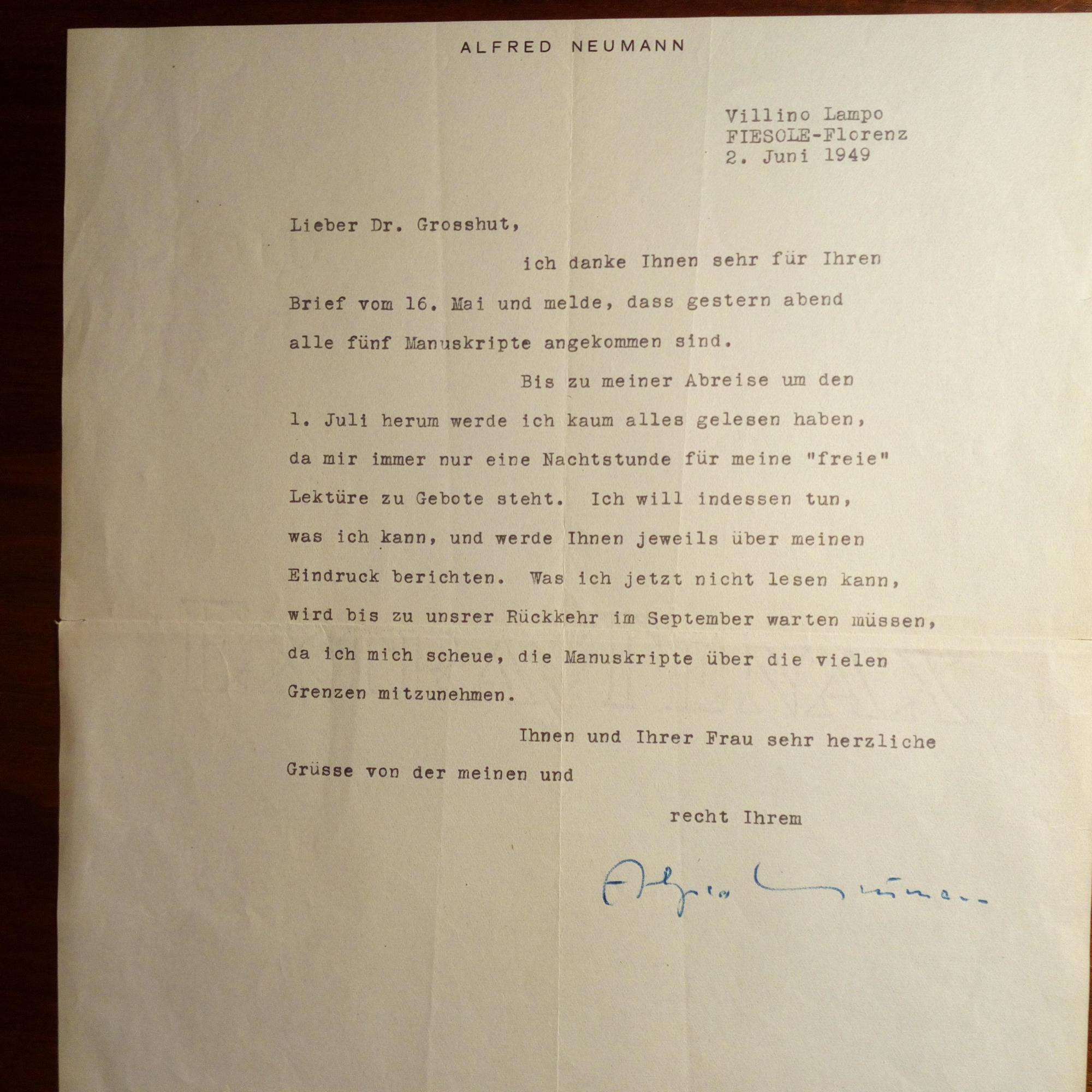 1895-1952, schweiz. Schriftsteller - Br. m. U., Florenz 2.6.1949, ¾ S. 4°, gedr. Name am Kopf. An den dt.-jüd. Juristen u. Schriftst. Friedrich Sally Grosshut: Kann die ihm gesandten Manus-kripte z.Zt. nicht lesen, ...da mir immer nur eine Nachtstunde für meine "freie" Lektüre... bleibe. Er werde es aber nach seiner Reise nachholen.