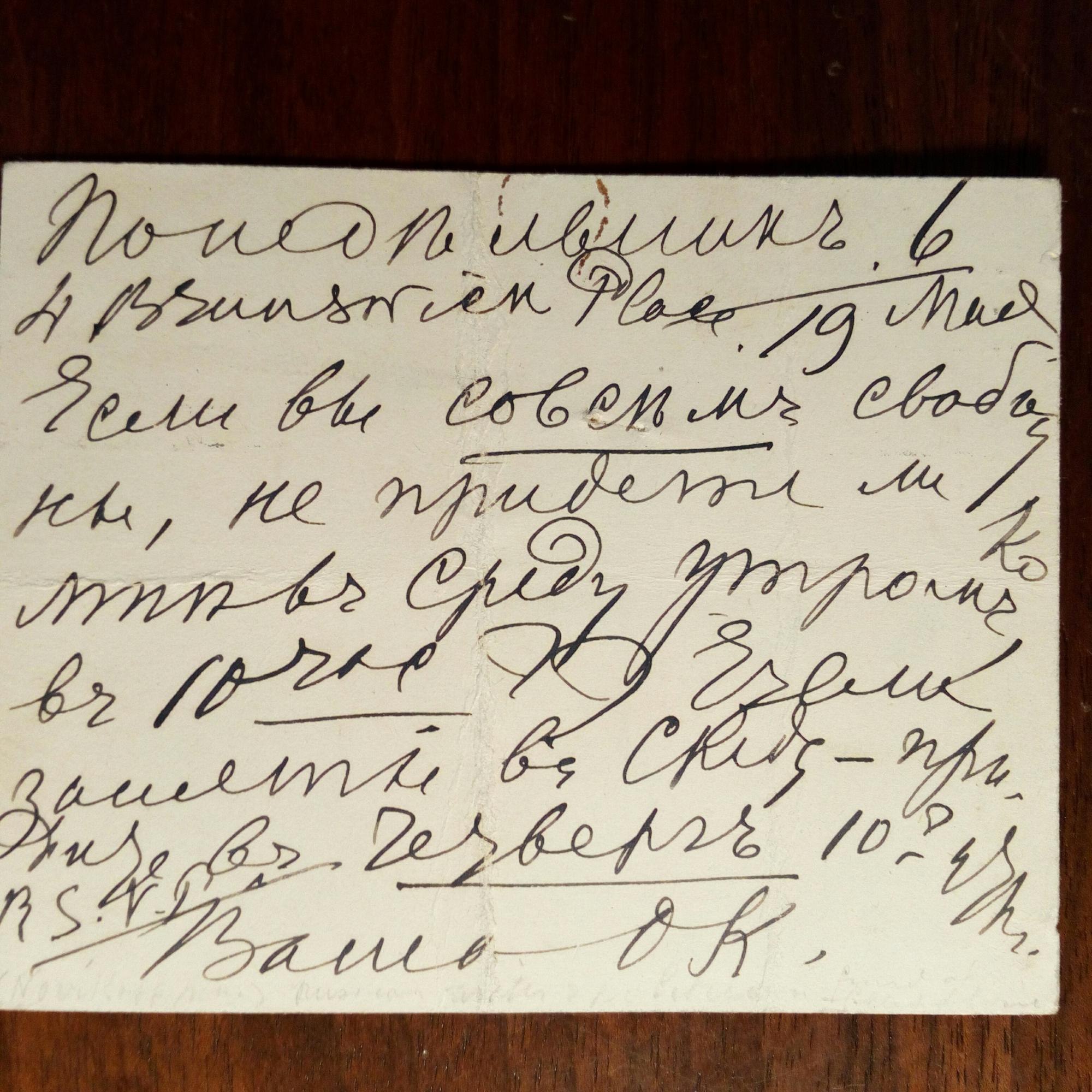 1842-1925, russ. Schriftstellerin, Übersetzerin, Salonnière und Außenpolitikerin in England, Geliebte von Gladstone - E. postal. Postkarte mit U. ("OK", für ihr Pseudonym "Olga Kiriett", nach ihrem Geb.namen Kirejeva), (London 15.4.1913), in der Höhe gefaltet. Einladung für Mrs. Brandman in Hampstead Heath (London).