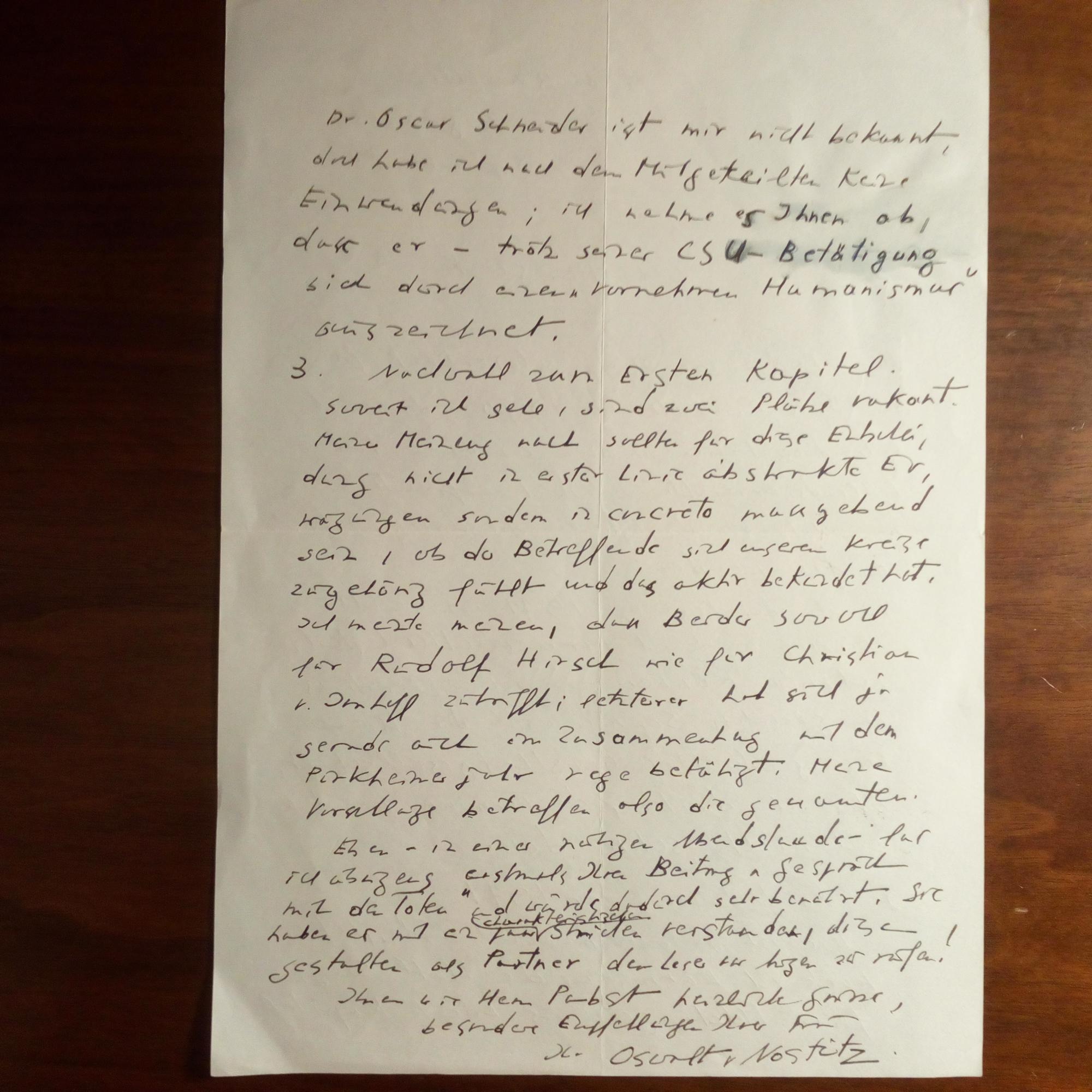 1908-97, Diplomat, Übersetzer und Schriftsteller - E. Brief mit U., Brüssel 15.9.1970, 2 S. 4°, kl. Wasserfleck. An den Verleger und Veranstalter von Tagungen auf seinem Schloss bei Nürnberg Karl Borromäus Glock (1905-85). ...An der Tagung 1971 im Zeichen Dürers werde ich voraussichtlich teilnehmen...befürworte ich wärmstens die Wahl Siegfried Melchingers ins zweite Kapitel. Dr. Oscar Schneider ist mir nicht bekannt...nehme es Ihnen ab, dass er - trotz seiner CSU-Betätigung sich durch einen "vornehmen Humanismus" auszeichnet... und über andere Mitglieder "unseres Kreises".
