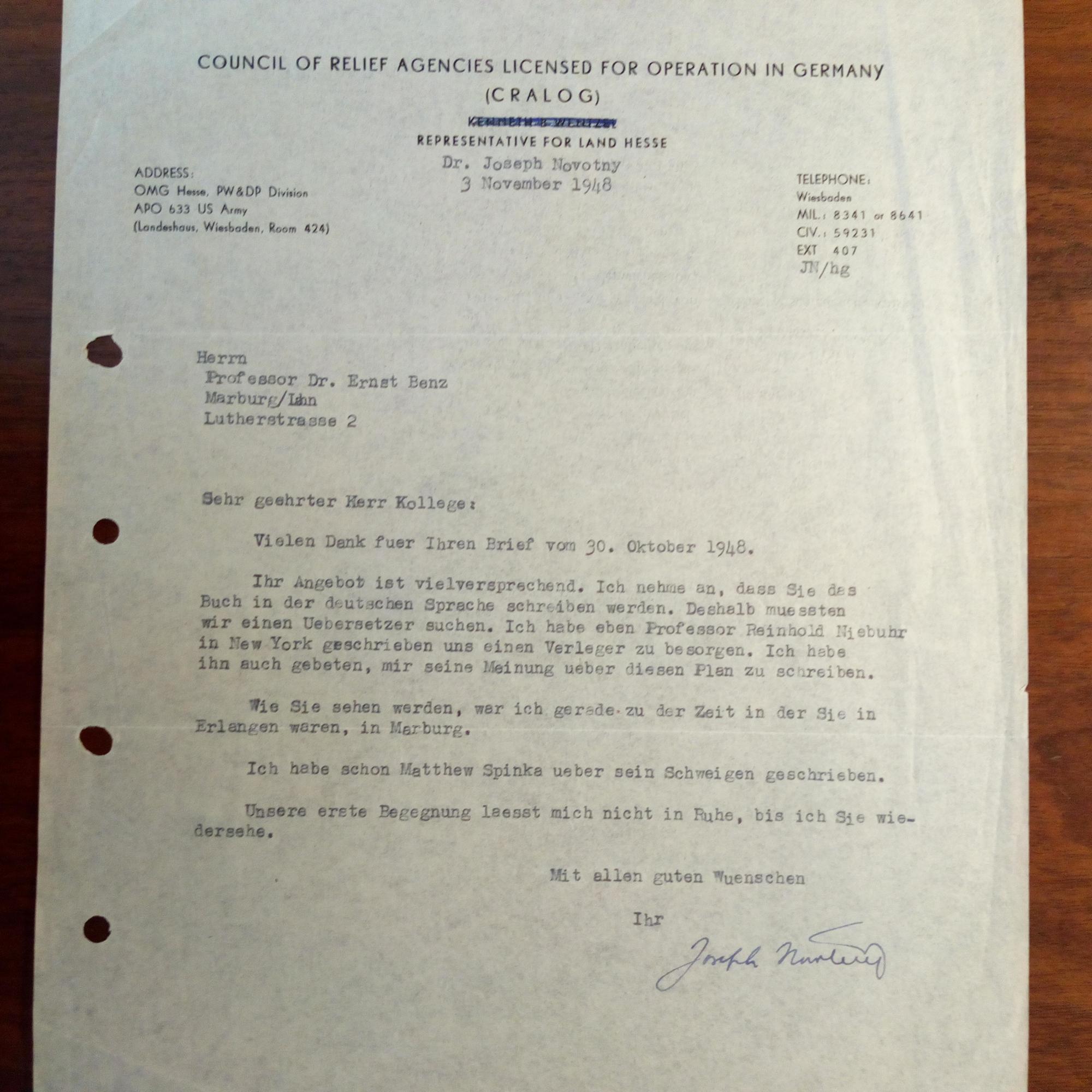 US-Theologe und Staatsbeamter - Br. m. U., (Wiesbaden) 3.11.1948, 1 S. 4°, Br.kopf der "CRALOG" (Council of Relief Agencies...) "...representative for Land Hesse", gel. An den Theologen Ernst Benz (1907-78) in Marburg: ...mussten wir einen Uebersetzer suchen. Ich habe eben Professor Reinhold Niebuhr in New York geschrieben ... Unsere erste Begegnung laesst mich nicht in Ruhe, bis ich Sie wiedersehe...