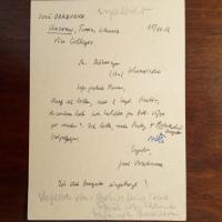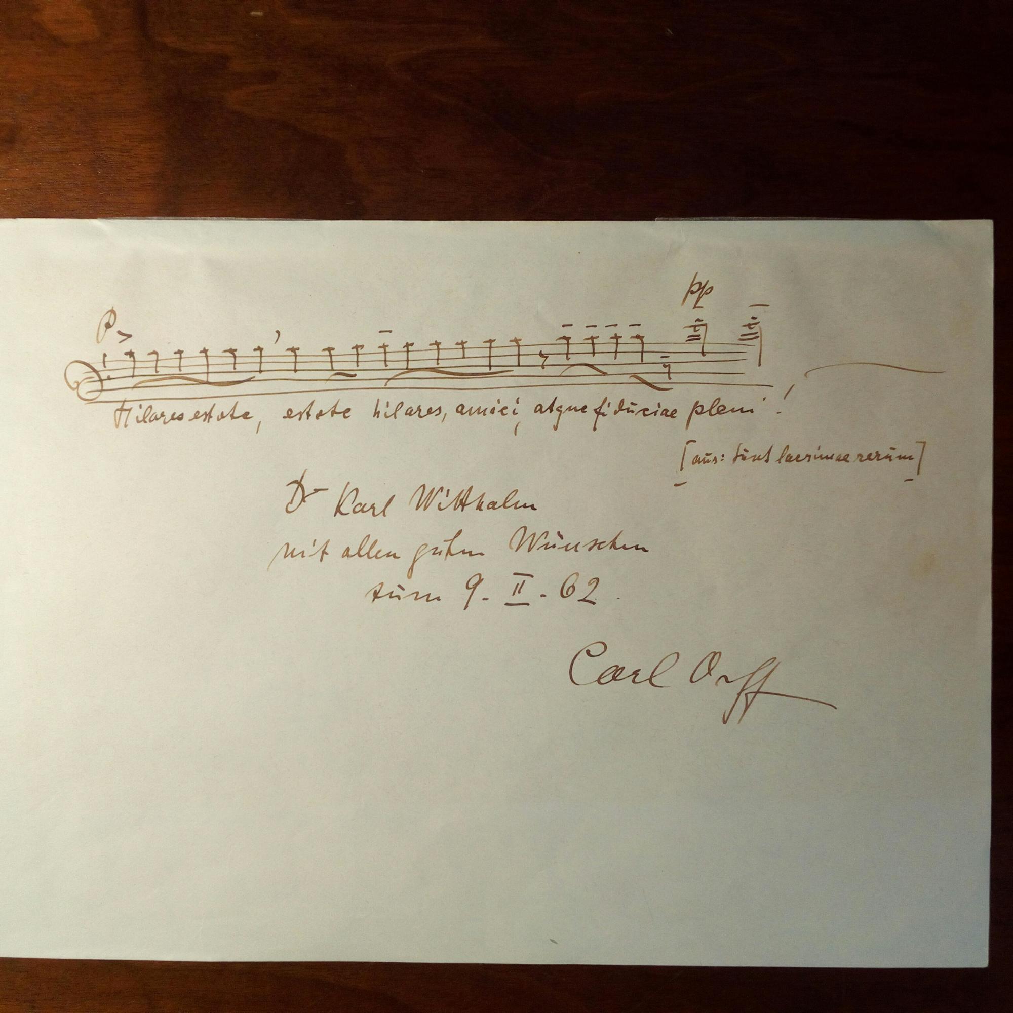 1895-1982, Komponist - 1. Brief mit U., Diessen (Ammersee) 28.12.1955 1 S. gr. 8°quer, gel., Br.kopf.. Gibt dem Münchner Verl.-buchhändler Hans Arens (1901-83) Hinweise zu Fotos u. Infos über sich und ...Das Manuskript habe ich an Prinz Konstantin gleich wieder zurückgeben lassen... Dazu Pfo. (Hochglanz, Atelier Fayer, Wien) mit U., kl. Randschaden. 2. E. Zeilen und U., 11.1.1956, 1 S. gr. 8° quer, Br.kopf. Glückw. zur Eröffnung des Theater-Neubaus in Münster. Dazu Karte mit mont. kl. Druck-Pfo., U. und D. Jan. 1956. 3. Brief mit U., Diessen 29.2.1956, ½ S. 4°, Durchschr.papier, kl. Altersspuren. An den Musikwisse. Peter Gradenwitz (1910-2001) in Tel Aviv: ...Bis Sie nach hier komm werden...werden weitere Platten vorliegen (Trionfo di Afrodite, Catulli Carmina...im Mai wird die ganze Kluge in London aufgenommen... und zu Buch über sich. 4. E. postal. (1961) Ansichtskarte (Kurhaus Murnau) mit U. Dankt dem Dichter Gerhard Deesen (1904-98) in Kaufbeuren für Wünsche. 5. Blatt mit e. Notenz. ("aus: Sunt lacrimae rerum"), Widm. für den Vors. der Münchner VHS Karl Witthalm (1897-1966) mit U. 6. Brief mit U., 14.7.1962, 1 S. 8°, Br.kopf. An Prof. Wilhelm in Nürnberg: Möchte ihn trotz Zeitmangels persönl. sprechen. 7. Pfo. mit U. und D. Feb. 1972, e. Gruß auf Rückseite. 8. Kl. Blatt mit e. Grüßen und U. Weitere U. von seiner Mitarbeiterin Gunhild Keetmann (1904-90). Zus. mit je Druck-Pfo. mont. auf 4°. 9. Brief mit U., Diessen 7.2.1989, ¾ S. 4°, Br.kopf, gel., seiner Witwe Lieselotte (1930-2012). Dankt Fischer für Werk-Editionen. ...Wollen wir hoffen, dass...es wieder einmal eine Aufführung der ganzen "Trionfi" in der Staatsoper gibt... (11 St.).
