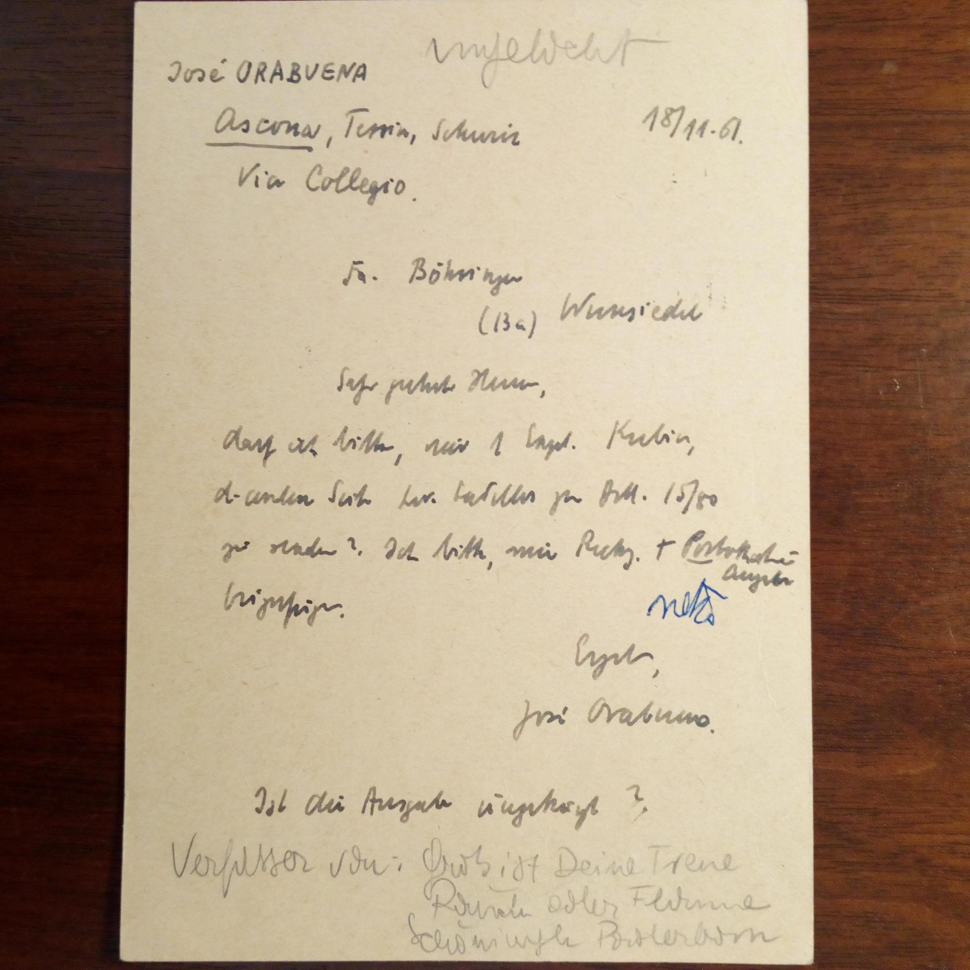 1892-1978, dt.-jüd. Schriftsteller - E. postal. Postkarte mit U., Ascona 18.11.1961. Bestellt bei einer Buchhandlung in Wunsiedel eine spezielle Ausgabe von Kubins "Die andere Seite".
