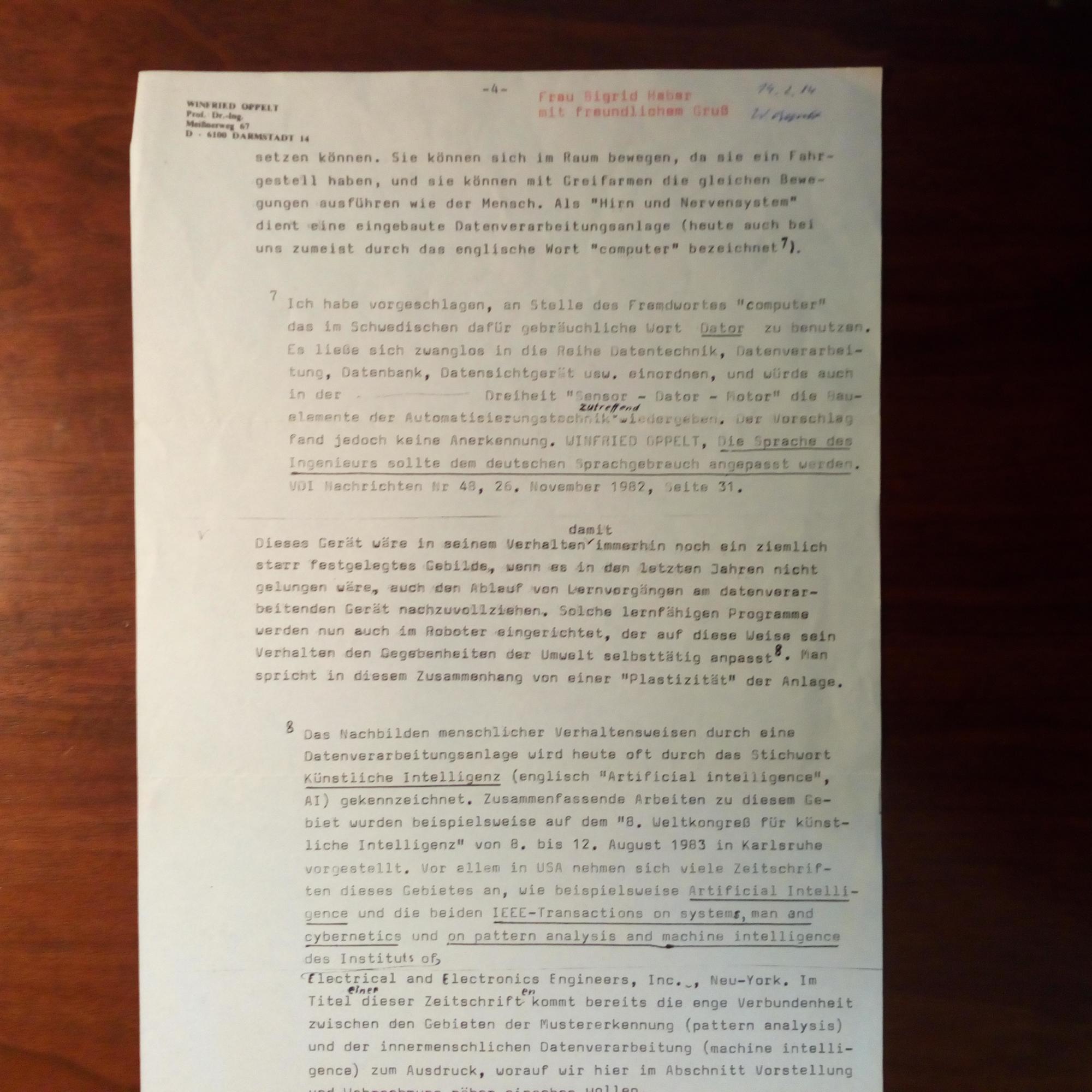 1912-99, Ingenieur, Prof. in Darmstadt - Typoskript (4 S. aus einem Aufsatz über Fremdwörter in der EDV), nachträgl. am Kopf mit Widm., U. und D. 14.2.1984 versehen.