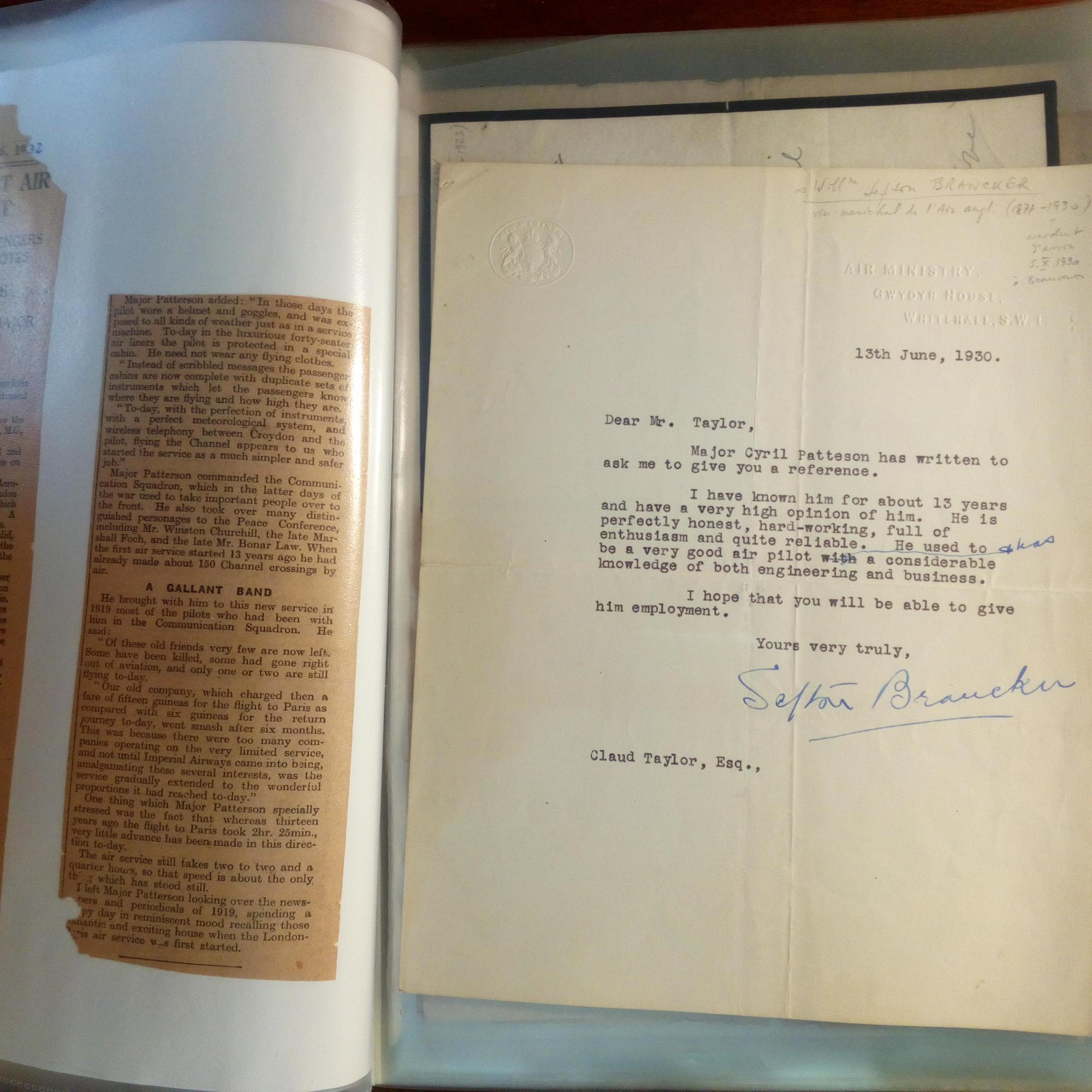 1888-1932, brit. Pilot der "Air Transport Soc." - 15 Dank- und Empfehlungsbriefe, je mit U., teilw. e., 1914-32, von ehem. Passagieren, manche 2-3 x, dabei Premierminister Andrew B. Law, die Generäle W. S. Brancker, B. T. Mahon und Scott, der russ. Konsul Serge Omorossow, der Luftfahrtdir. von China M. K. Tinn, und eine chines. Tusche-Kalligraphie. Dazu Durchschriften von anderen (u.a. Churchill), Bewerbungsunterlagen mit U. und e. Zusätzen, sein Logbuch u. a.