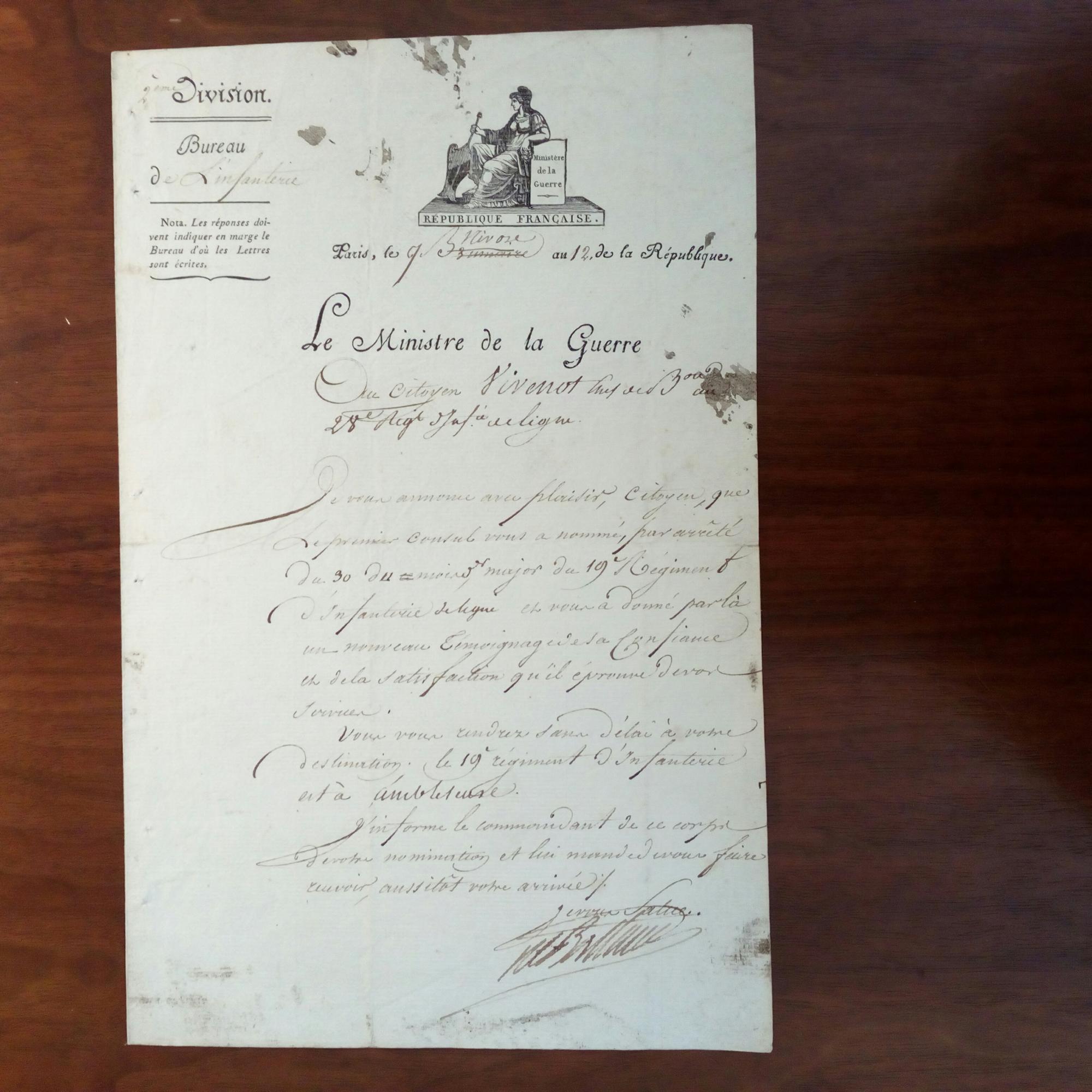 1753-1815, Vertrauter Napoleons, General und Politiker - Brief mit U., "Paris, le 9 Nivôse an 12. de la République" (31.12.1803), 1 S. folio, etw. fleckig. Als Kriegsmin. an "Citoyen Vivenot" beim 28. Inf.regiment: Teilt ihm die Ern. z. Major mit: ...Je vous annonce avec plaisir, Citoyen, que le premier Consul vous a nommé...et vous a donné par lá un nouveau Témoignage de sa confiance et de la satisfaction...Vous vous rendez sans délai à votre destination. Le 19´ régiment d'Infanterie est à ambleteuse (bei Calais)...