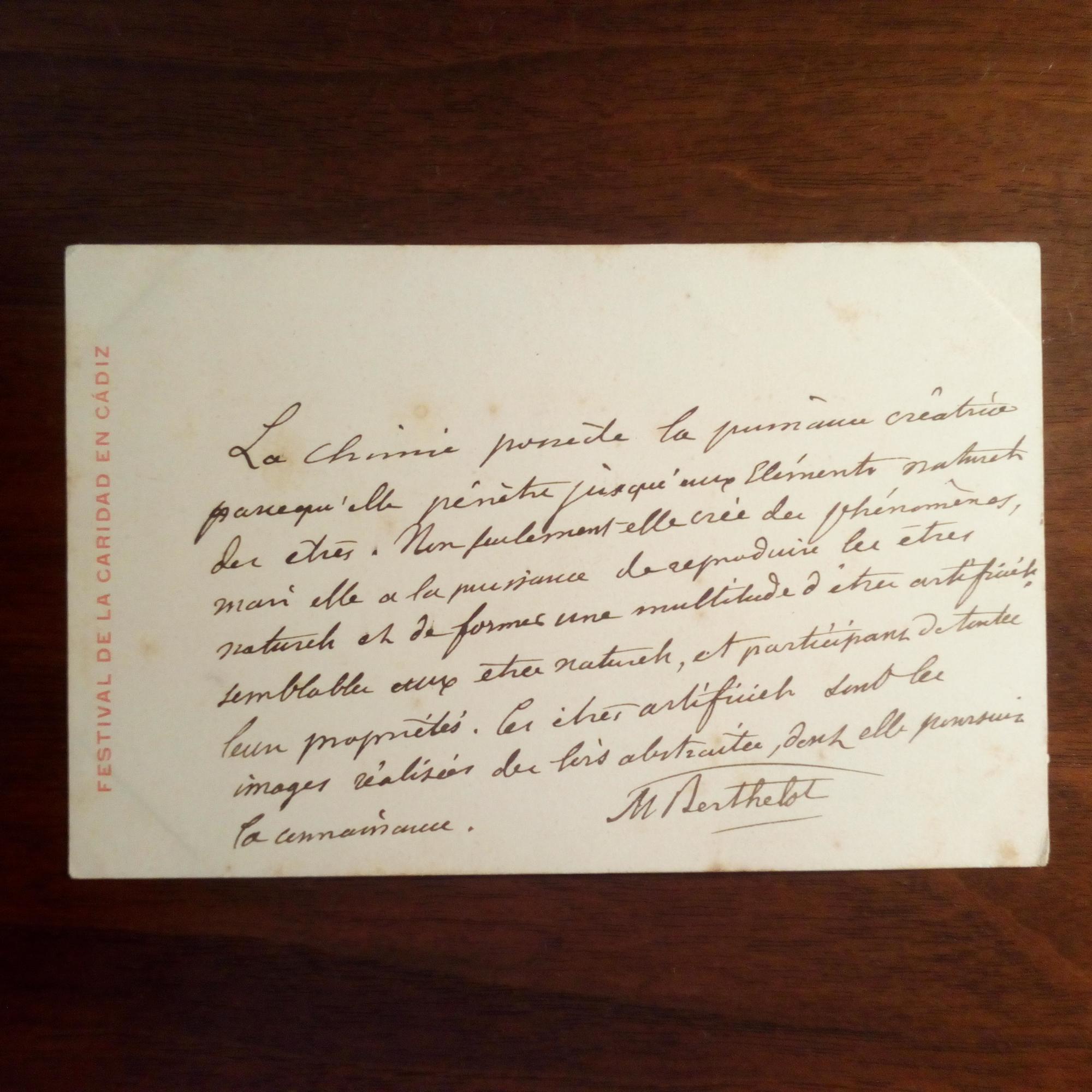 1827-1907, frz. Chemiker und Politiker - E. Zitat (9 Z.) und U. auf Karte des "Festival de la Caridad" in Cadiz, gering fleckig. "La chimie...Non seulement elle crée des phénomènes, mais elle a la puissance de reproduire les êtres naturels et de former une multitude d' êtres...