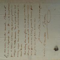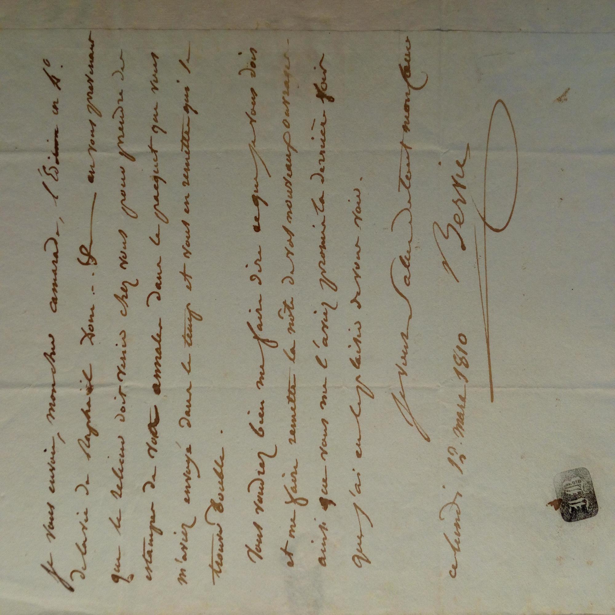 1736-1822, frz. Graphiker - E. Brief mit U., (Paris) 12.5.1810, 1 S. 4°, Emblem-Stempel, Siegelrest, Ränder verstärkt. E. Adr. an den Maler und Kunsthistoriker Charles Paul Landon (1760-1826) in Paris. Betr. Austauschs von kunsthistor. Schriften.