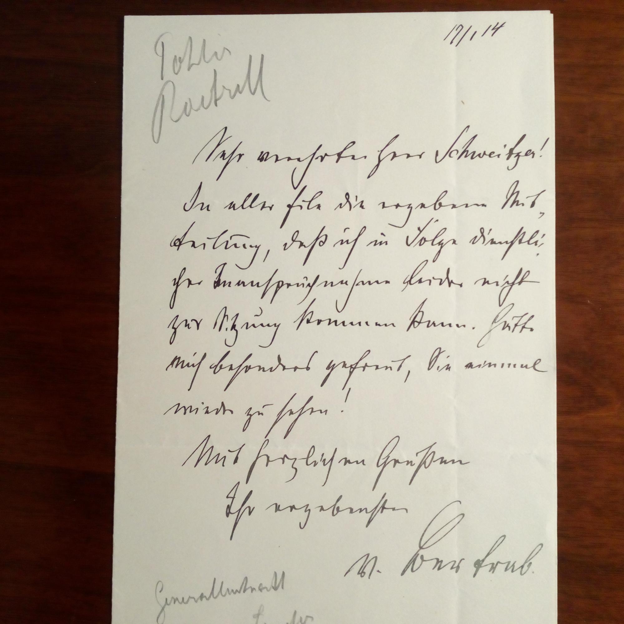 1857-1940, Infanterie-General und Chef der Landesvermessung - E. Br. m. U., 17.1.1914, 1 S. 8°, beschriftet. An Schweitzer: Kann zu einer Sitzung nicht kommen, obwohl er sich besonders gefreut hätte, ihn wiederzusehen.