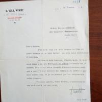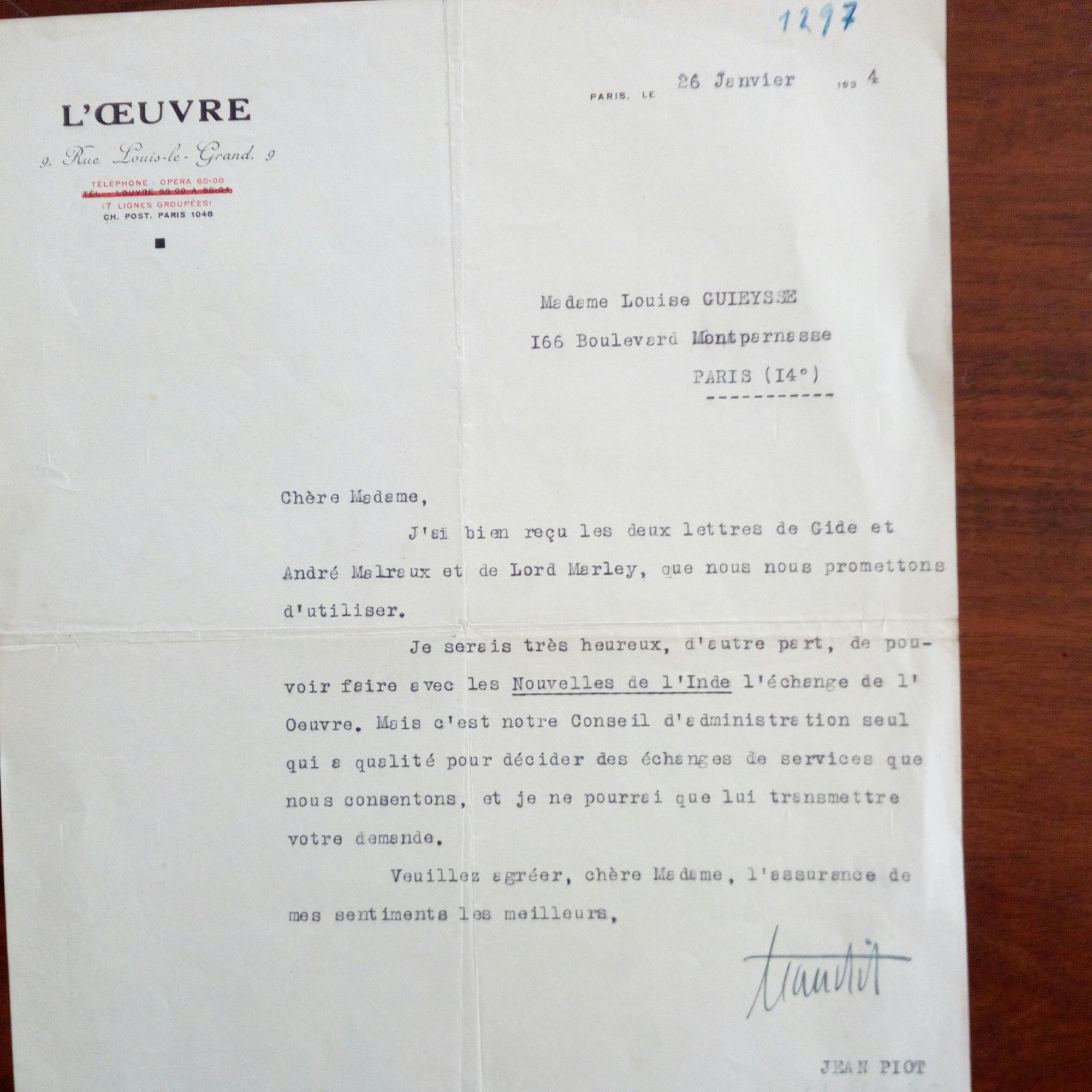 1889-1948, frz. Journalist und sozialist. Politiker - Brief mit U., (Paris) 26.1.1934, 1 S. 4°, Briefkopf der Zeitschrift "L'Oeuvre". An die Literaturwiss. und Kropotkin-Übersetzerin Louise Guieysse (1872-1954) in Paris: Dankt für Briefe von Gide, Malraux und Lord Marley. Er habe ihr Anliegen an die "Nouvelles de l'Inde" weitergegeben.