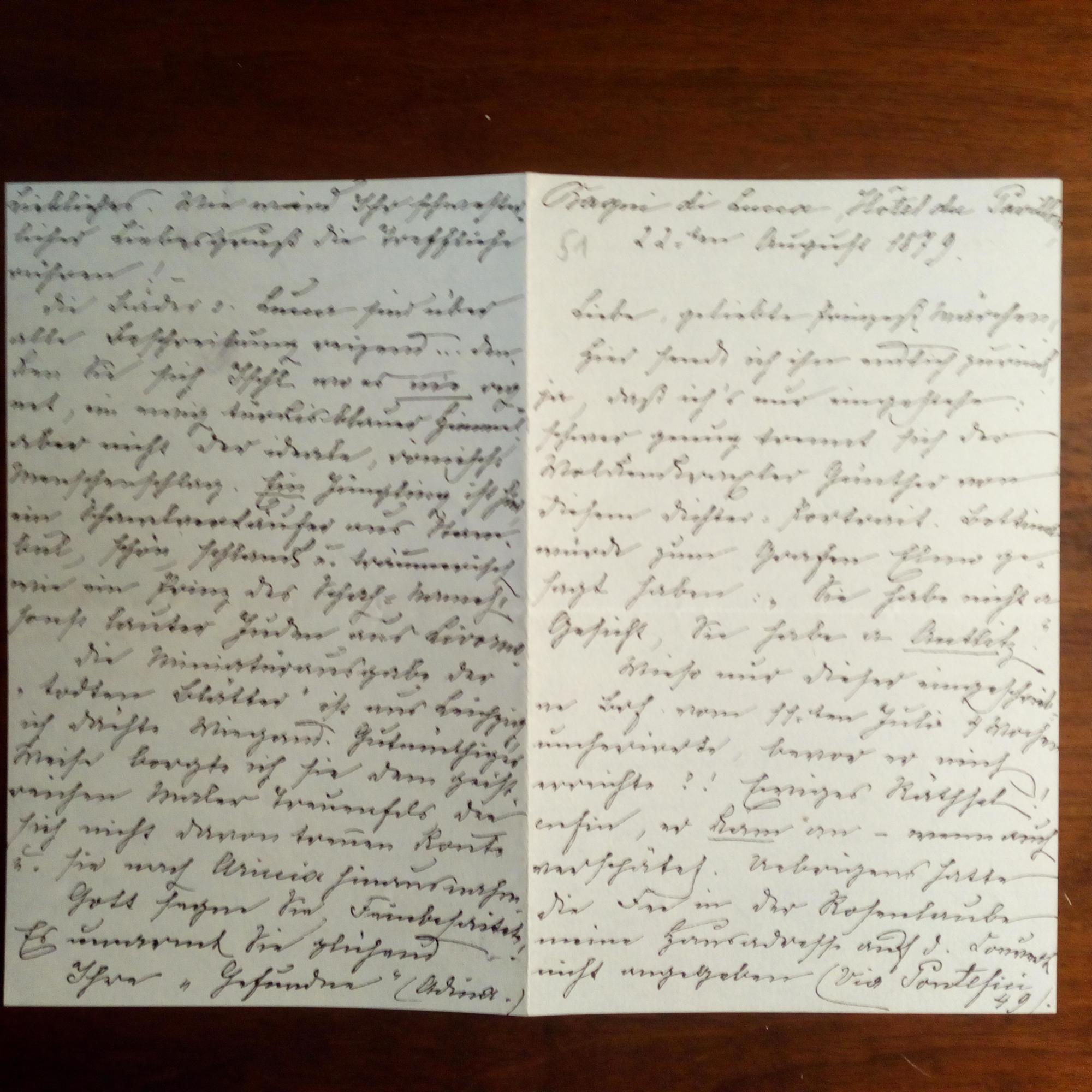geb. von Treskow, Pseudon. Günther von Freiberg, 1840-1918, Schriftstellerin - E. Br. m. U., Bagni di Lucca 22.8.1879, 4 S. kl.8°, kl. geschr. An "geliebte Prinzeß Märchen": Schickt ein Buch zurück: ...schwer genug trennt sich der Wolkenkanzler Günther von diesem Dichter-Porträt ... Sind Sie nicht Geliebte, aus ätherischem Stoffe geformt?..., über Marie Colban in Rom u. ihren Alltag: ...ein Jüngling ist hier ... träumerisch wie ein Prinz aus Schah-Hameh...