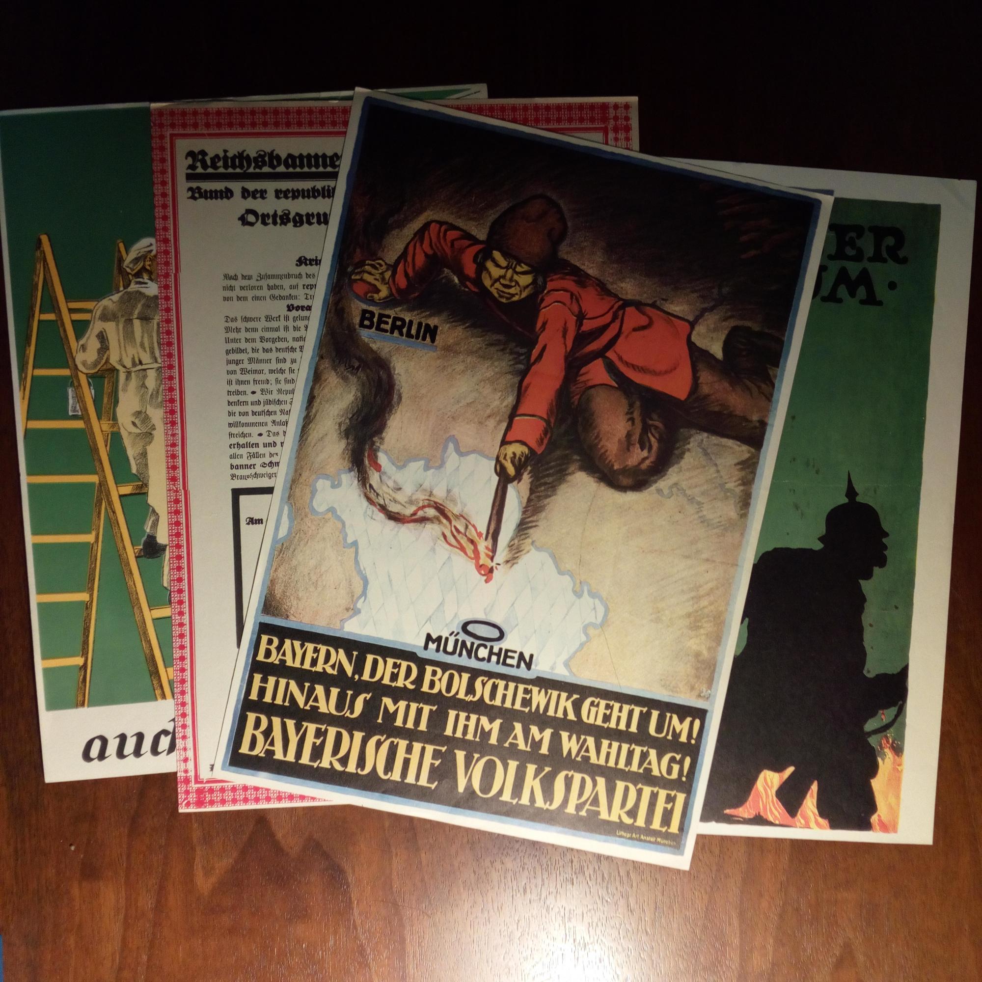 Vier Plakate (je 4°, gut erh.) aus den 20er Jahren: 1. Bayerische Volkspartei ("der Bolschewik geht um..."). 2. "Reichsausschuß für Sachwerterhaltung". 3. Gründungsversammlung des "Reichsbanners Schwarz-Rot-Gold", Braunschweig 1924. 4. "Remember Belgium - Liberty Loan".
