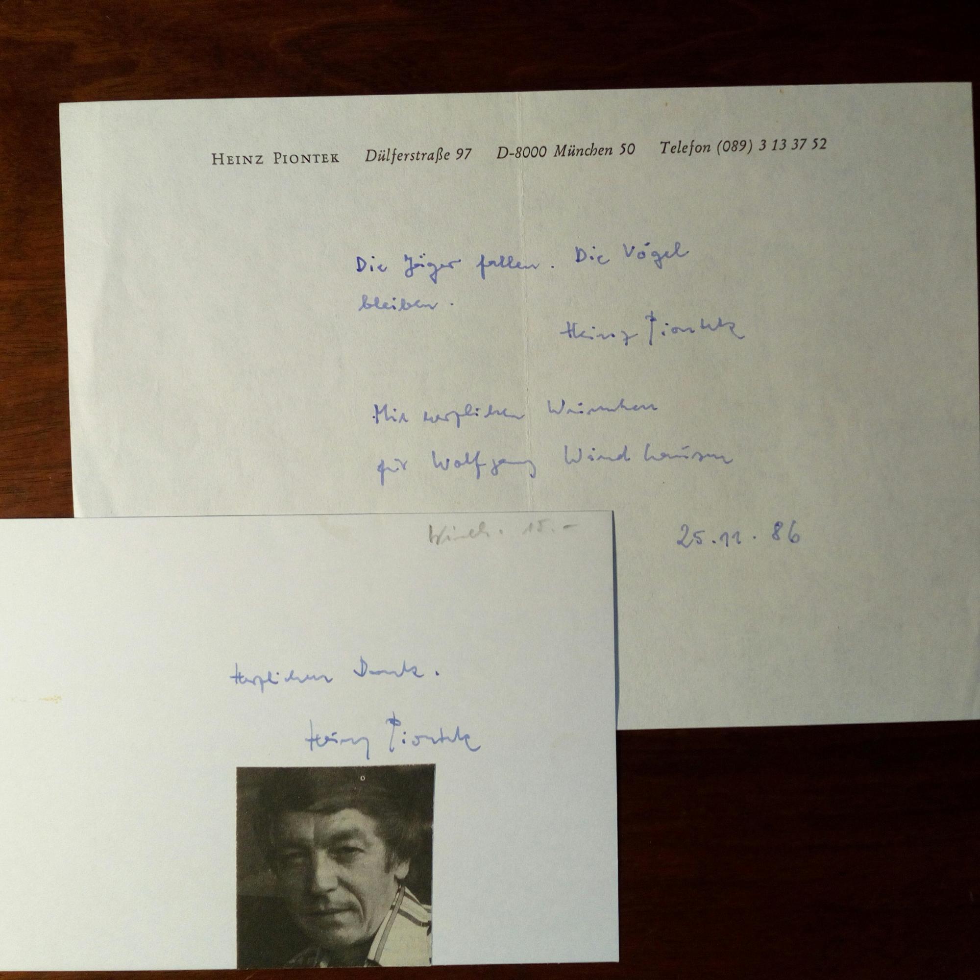 1915-2003, Schriftsteller - Karte mit mont. kl. Druck-Pfo., E. und U. Dazu 8°quer-Blatt mit e. Zitat ("Die Jäger fallen. Die Vögel bleiben."), Widm. und U., 25.11.1986, Br.kopf.