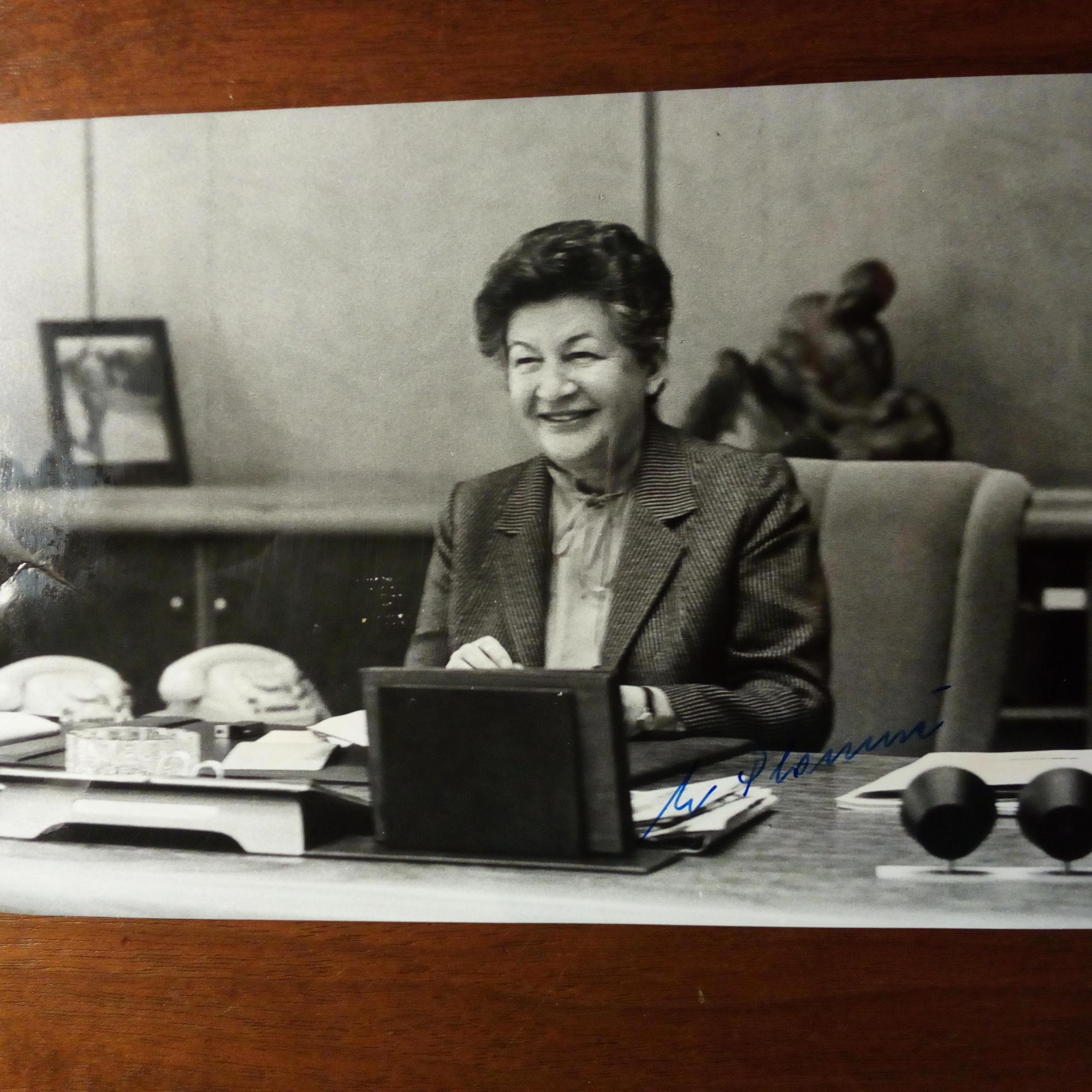 1924-2010, Min.präsidentin von Jugoslawien - Pfo. (Hochgl., ca. 8°quer, am Schreibtisch, ca. 1982, kl. Knickspur) mit U.