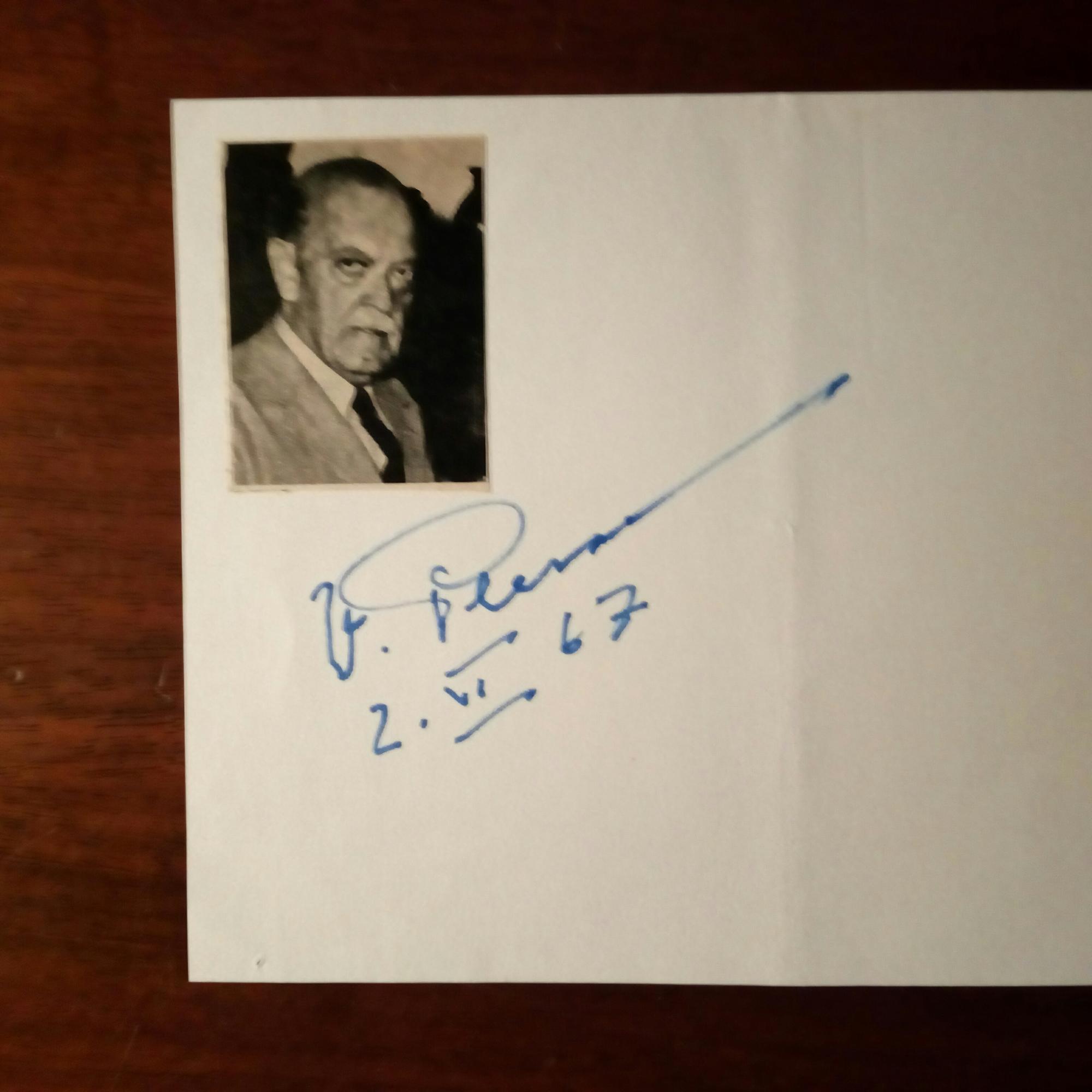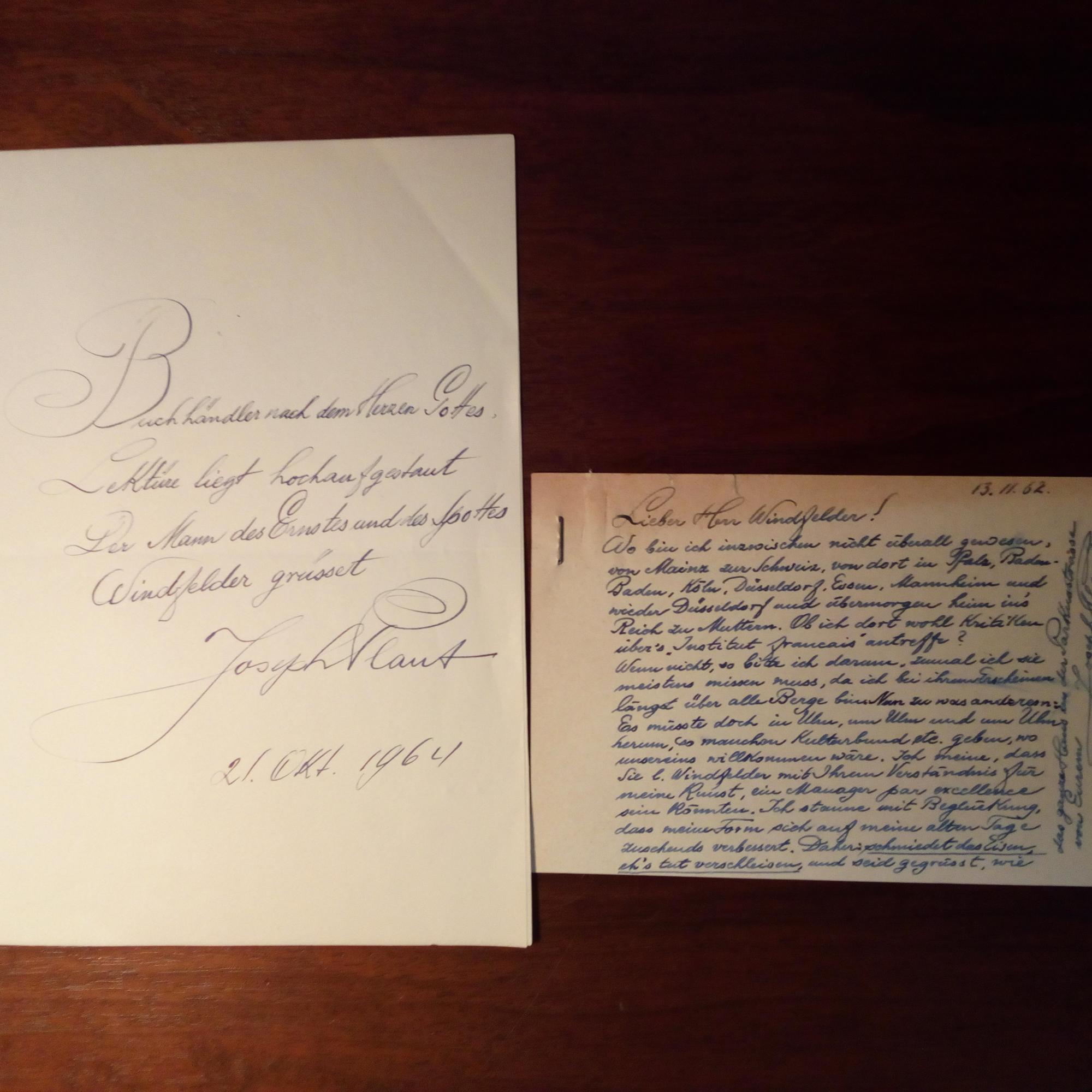 1879-1966, Sänger, Schauspieler und Schriftsteller - E. postal. Postkarte mit U., (Düsseldorf) 13.11.1962, kl. und dicht geschr., ger. Gebr.spuren. An Buchhändler Windfelder in Mainz, betr. gepl. Vortragsreise: ...staune mit Beglückung, dass meine Form sich auf die alten Tage zusehends verbessert...möchte mit Ihnen bei Bertelsmann renomieren... Beiliegen: Brief mit U., 1 S. 4°, an dens., 8°-Blatt mit schöner e. Widmung, U. und D. 21.10.1964, sowie v. seiner Gattin, der Sängerin und Schausp. Maria Schneider-Plaut (1888-1982): Pfo. (als "Agathe") mit U., Charlottenburg 26.2.1914.