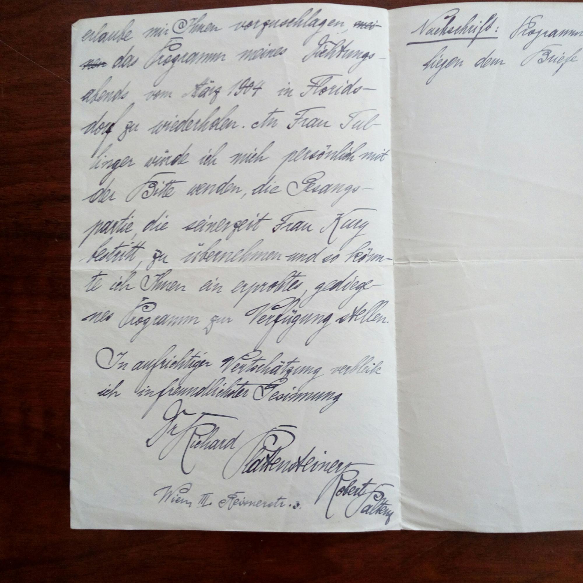 1878-1956, Wiener Dichter (auch Mundart) - E. Brief mit U. (zusätzl. mit dem Pseudonym "Robert Palten"), Wien 30.10.1904, 2 S. 8°, kl. Gebr.spuren. An Zeissberger betr. Lesungen in Floridsdorf (bei Wien). ...An Frau Tublinger würde ich mich persönlich mit der Bitte wenden, die Gesangspartie die seinerzeit Frau Krug bestritt, zu übernehmen... Beiliegen: ein im Brief erwähntes handschriftliches Programm und gedr. Faltblatt mit Auszügen von Kritiken.