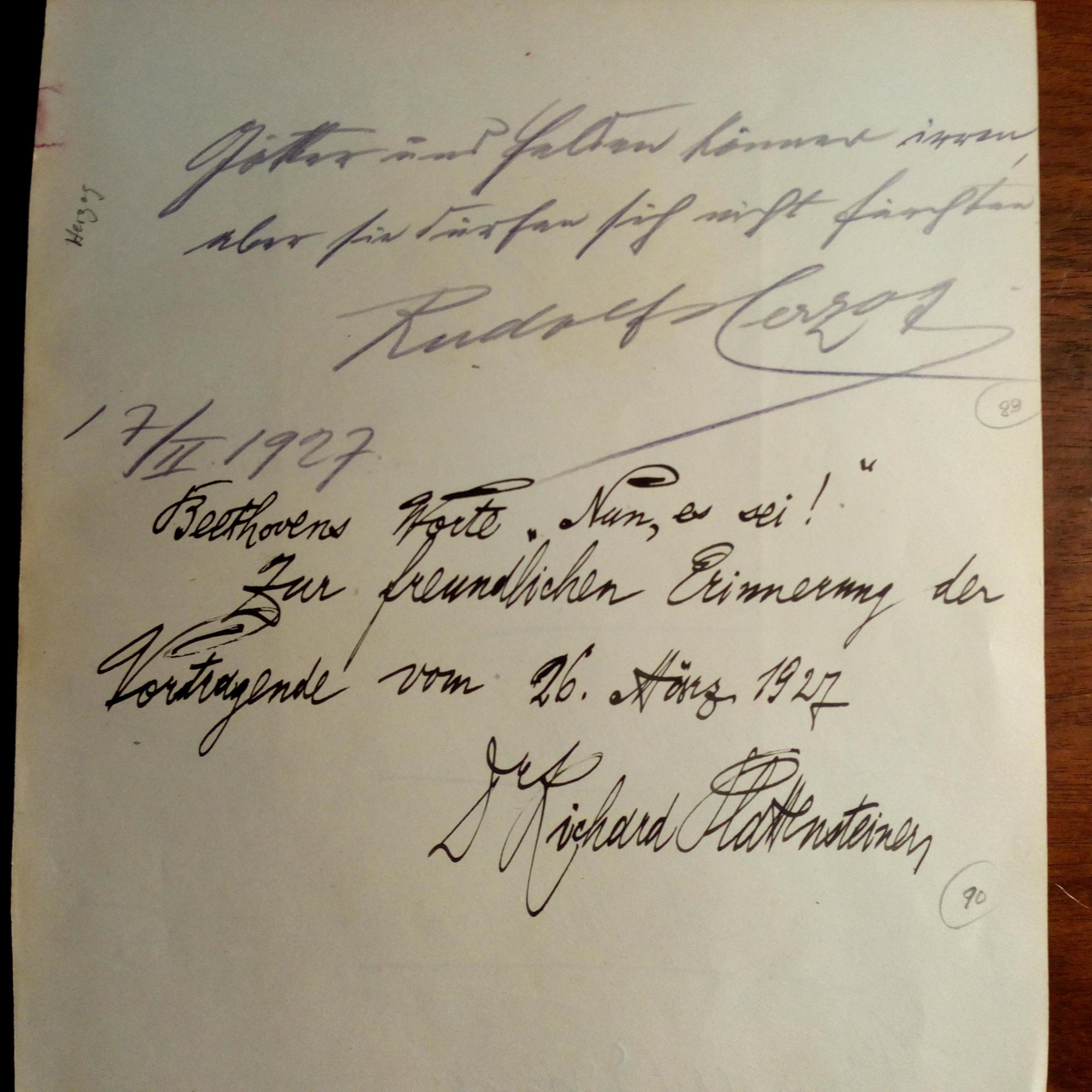 1878-1956, österr, Schriftsteller, Rezitator und Komponist - 4°-Blatt mit e. Zitat. Zu seinem Vortrag zu Beethovens Worten "Nun es sei!", Gießen 26.3.1927. Darüber Zitat und U. von dem Schriftsteller Rudolf Herzog (Kopierstift). Rücks. mit 3 ähnlichen: Frank Thiess (Schriftsteller), Elisabeth Ohloff (Sängerin) u.a.
