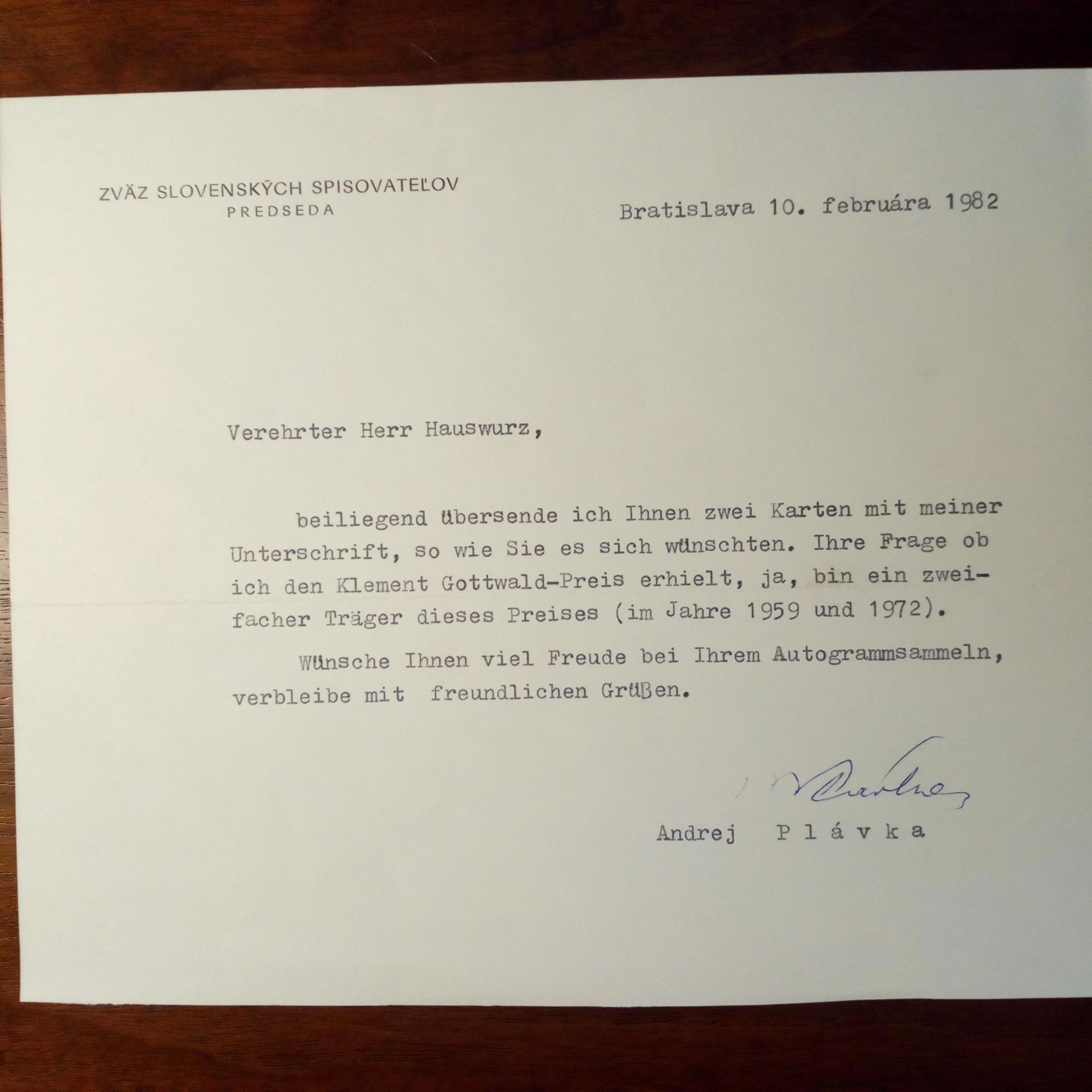 1907-82, slovak. Schriftsteller und Kommunist - Brief mit U., Bratislava 10.2.1982, 1 S. gr. 8°quer, mit postal. Umschlag. Dt. An einen Sammler: Schickt Karten mit U. (liegen nicht bei). Bestätigt, dass er bereits zwei mal den Klement-Gottwald-Preis erhalten habe.