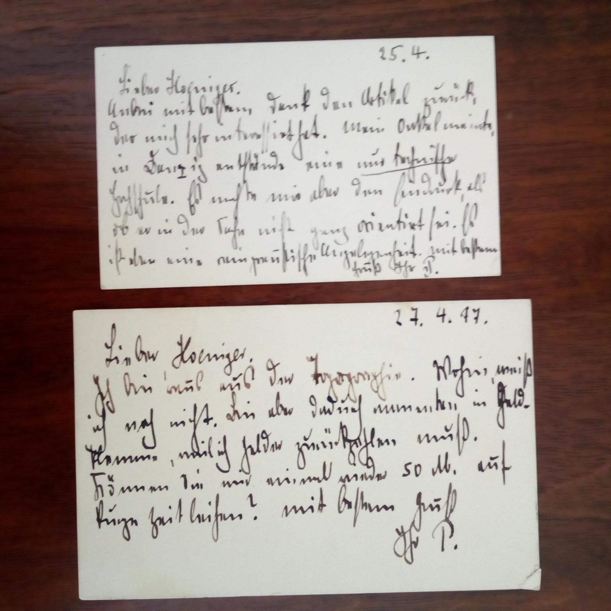 1864-1914 (gefall.), preuß. Militär - 2 e. Briefkarten mit U. ("P."), je auf Rückseite seiner Visitenkarte. An den befreundeten Historiker und Publizisten Robert Hoeniger (1855-1929) in Berlin: 27.4.1877: Weiß noch nicht, wohin er verlegt werde und bittet, ihm "wieder 50 M. auf kurze Zeit" zu leihen. Nach 1904 (im Gen.stab): Betr. eines Presse-Artikels. Sein Onkel in Danzig sei "nicht ganz orientiert".