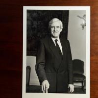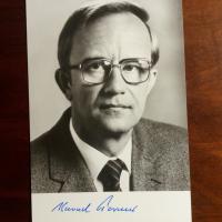 1935-2022, luxemb. Politiker, Außenminister - Pfo. (Hochglanz, ca. kl. 8°) mit U. auf Rückseite. Dazu Ded.karte.
