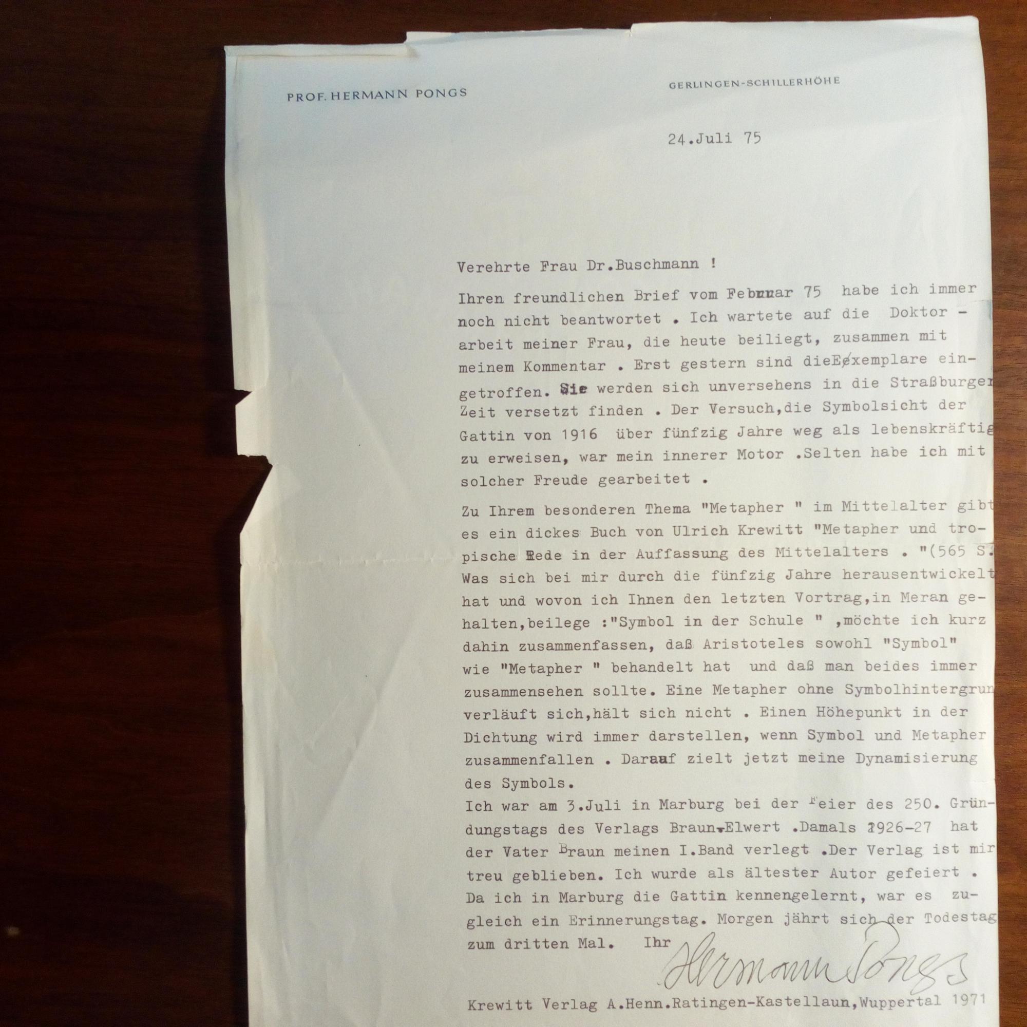 1889-1979, Literaturhistoriker und Philosoph - Br. m. U., Gerlingen-Schillerhöhe 24.7.1975, 1 S. 4°, Br.kopf, kl. Randschäden. An Frau Dr. Buschmann m. fachlichem Inhalt: ...Der Versuch, die Symbolsicht der Gattin von 1916 über fünfzig Jahre weg als lebenskräftig zu erweisen, war mein innerer Motor... Dazu e. Neuj.wünsche u. U. auf Umschl. verso des Druckes seines Aufsatzes "Symbolik bei Teilhard de Chardin", Marburg 1974.
