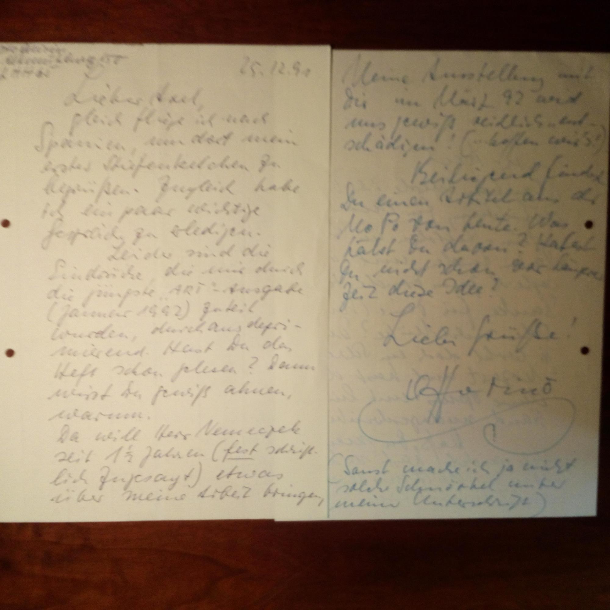 1927-2022, Maler - 2 e. Briefe mit U., zus. 4 S. 4°, einer mit e. Abs, einer mit Br.kopf, 30.11. und 25.12.1991, gel. An den Hamburger Kunst-Journalisten Axel Sallowsky betr. Publikationen. U. a. bedauert er, dass er trotz Bemühens von der "Art...total verschwiegen" werde.
