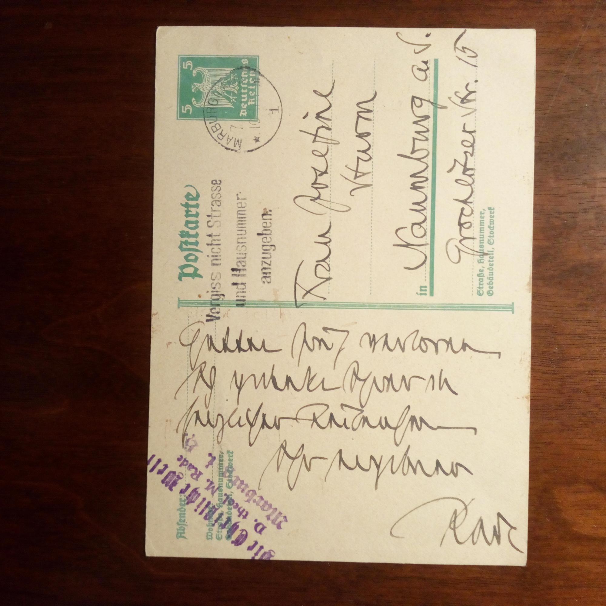 1857-1940, evangel. Theologe und Politiker - E. postal. Postkarte m. U., Marburg 7.9.1927. An die Witwe des Dichters August Sturm (1852-1923), Josefine, in Naumburg betr. eines Gedichtbandes ihres Gatten, dessen Besprechung bisher unterblieben war.