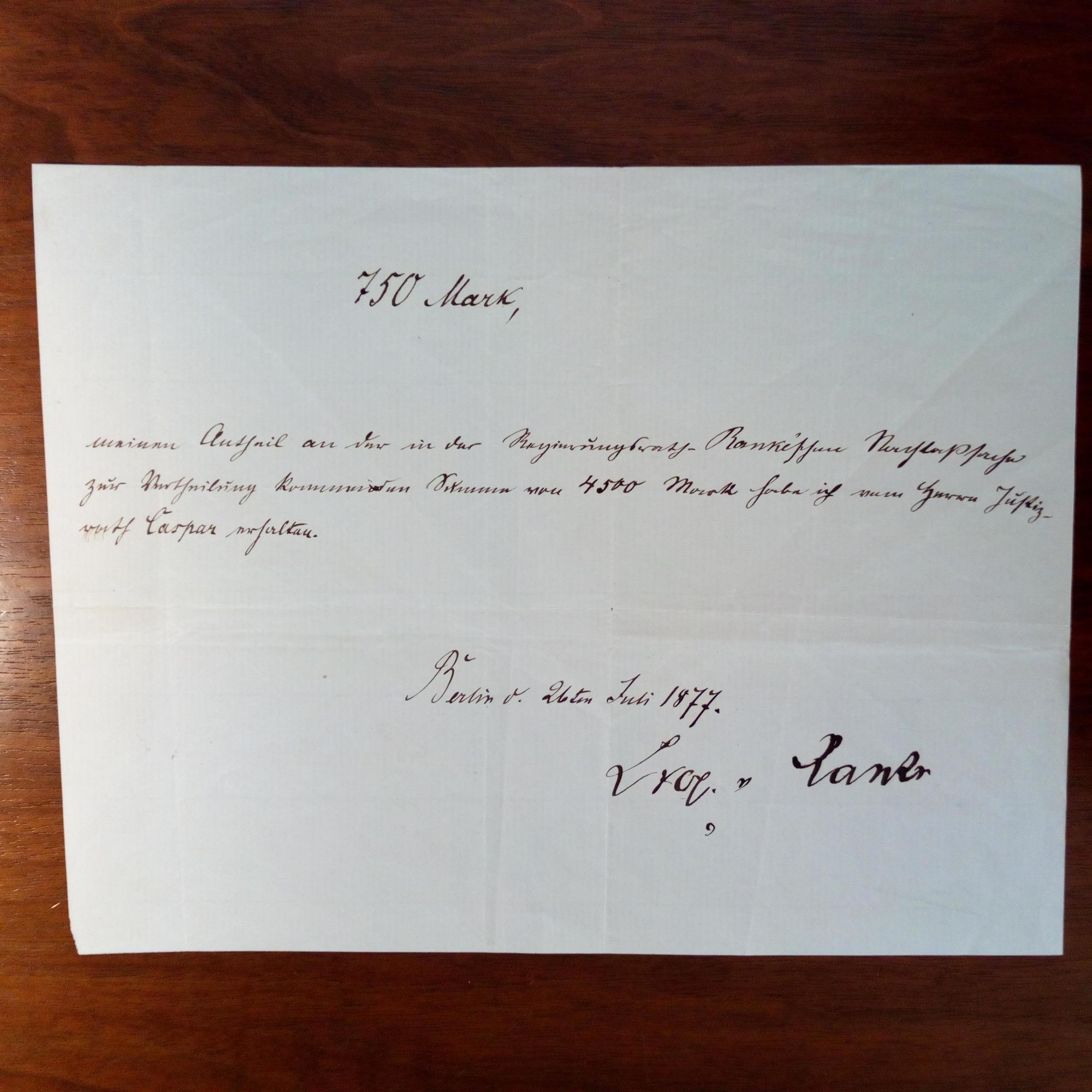 1795-1886, Historiker - Schriftstück mit U., Berlin 26.7.1877, 1 S. 4°quer. Quittung über 750 Mark für seinen "Antheil an der in der Regierungsrath-Ranke'schen Nachlaßsache zur Vertheilung kommenden Summe von 4500 Mark...". (Betr. Nachlasses seines Bruders, des Kunst-Sammlers und Schriftstellers Wilhelm Friedrich R., 1804-71).