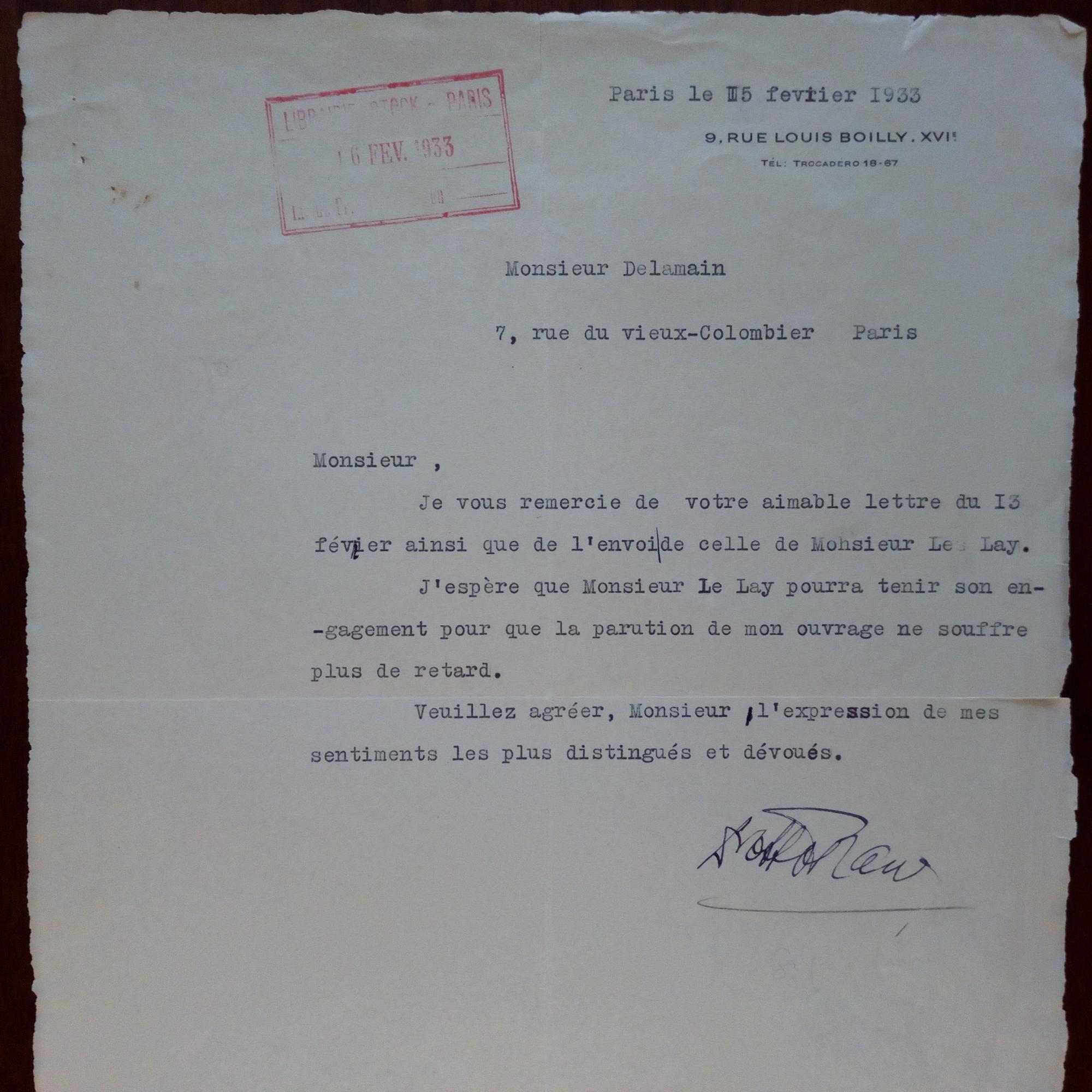 1884-1939, österr. Psychoanalytiker - Brief mit U., Paris 5.2.1933, ca. ½ S. 4°, Eing.stempel. Dankt Maurice Delamain (1883-1974, Schriftst. und Übersetzer, Dir. der "Librairie Stock") für einen Brief und Weitergabe eines Schreibens betr. der frz. Ausgabe seines Buches "Wahrheit und Wirklichkeit": ...J'espère que Monsieur Le Lay pourra tenir son engagement pour que la parution de mon ouvrage ne souffre plus de retard...