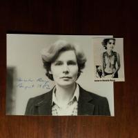 1935-2015, Schriftstellerin - Pfo. (Hochglanz, quer) mit U. und D. August 1982. Beiliegt Blatt mit U. und D. 1976, mit postal. Umschlag (U. im Abs.) und kl. Druck-Pfo. (aus Zeitschrift, bei ihrem barbusigen Auftritt auf der Tagung der "Gruppe 47" 1967).
