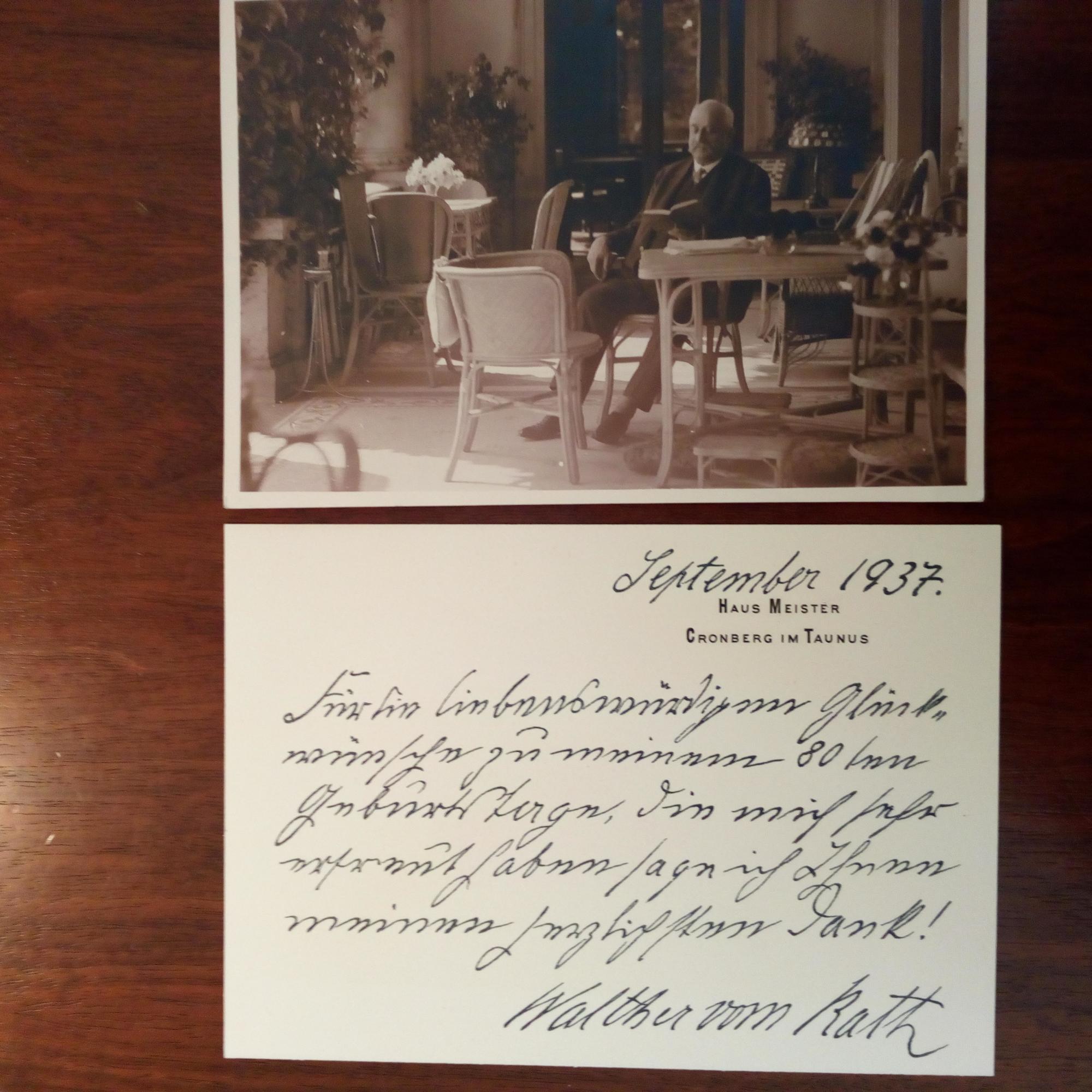 1857-1940, Industrieller und Politiker - Privates Pfo. als e. Ansichtskarte mit U., Cronberg 15.9.1927, kl. Mont.spur am Rand. Dankt für Geb.wünsche. Beiliegt ähnl. Faksimile-Briefkarte.