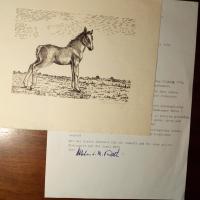 1923-2000, Maler und Grafiker - Schöner Linolschnitt eines Fohlensm ca. 4° quer) mit Bleistift-Signatur. Dazu Brief mit U., (Bad Salzuflen) 15.4.1978, 1 S. 4°. An den Galeristen Mahncke in Hamburg. Dankt für "Zeilen und für Ihre Mühen, alle die wunderlichen Ereignisse zu einer wirklich reizenden Kette zusammenzuflechten" und für Münzen.