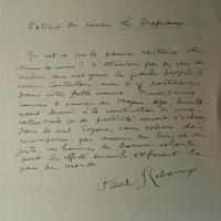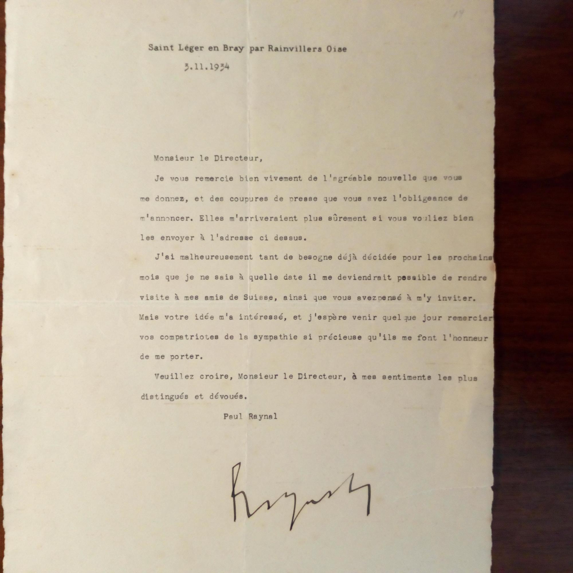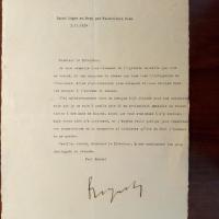 1885-1971, frz. Dramatiker - Brief mit U., Adr.briefkopf "Saint Léger en Bray par Rainvillers Oise" 3.11.1934, 1 S. 4°, kl. Einriss. An einen Direktor: Dankt für eine "agréable nouvelle" und Presseausschn. ...votre idée m'a intéressé, et j'espère venir quelque jour remercier vos compatriotes...