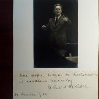 1892-1970, Dirigent, Kapellmeister in Hamburg - kl. Blatt mit Widm., U. und D. 29.1.1942, mont. unter Pfo. (ca. 8°, beim Dirigieren) auf 4°. "Dem großen Orchester des Reichssenders...".