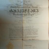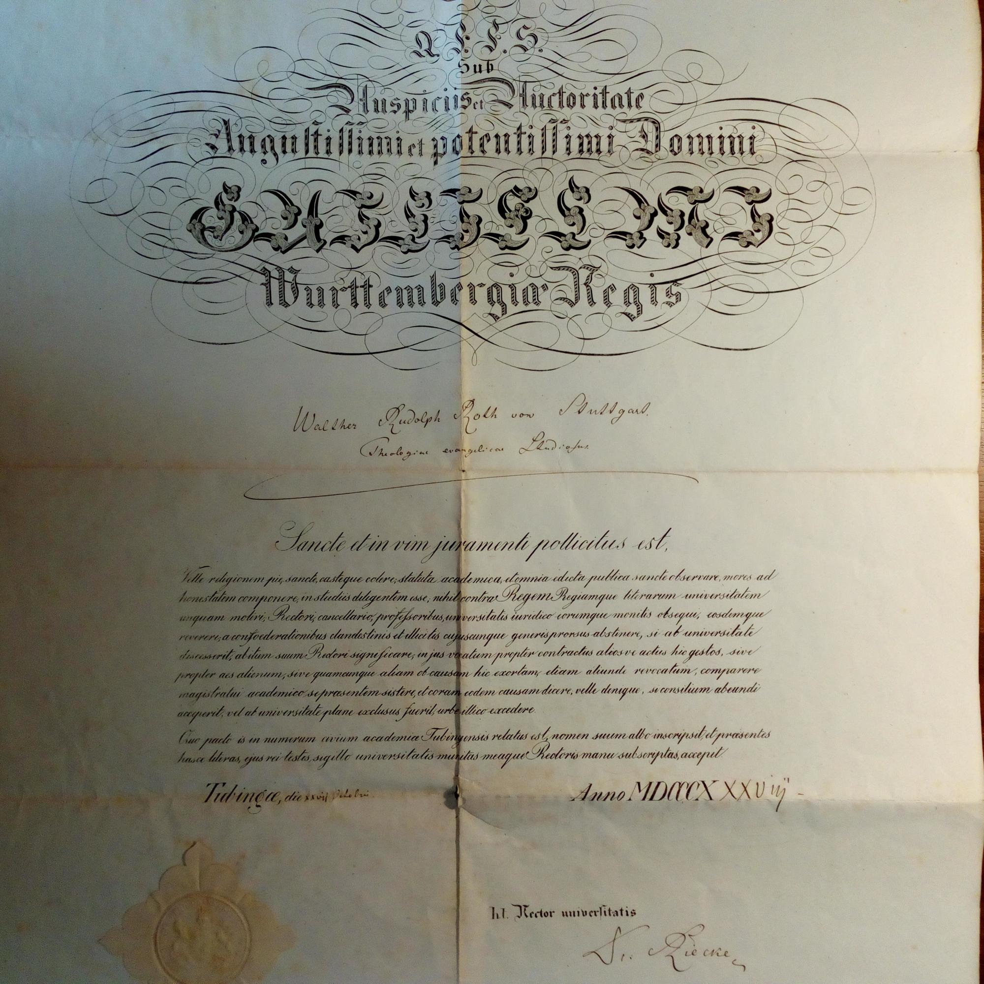 1790-1876, Mediziner, Rektor der Universität Tübingen - Große Urkunde (52 x 43cm, Stich-Vordruck), e. ausgefüllt mit U., 27.10.1838, papierged. Siegel. Immatrikulationsbescheinigung für den Religionswissensch. und Indologen Walther Rudolph Roth (1821-95).