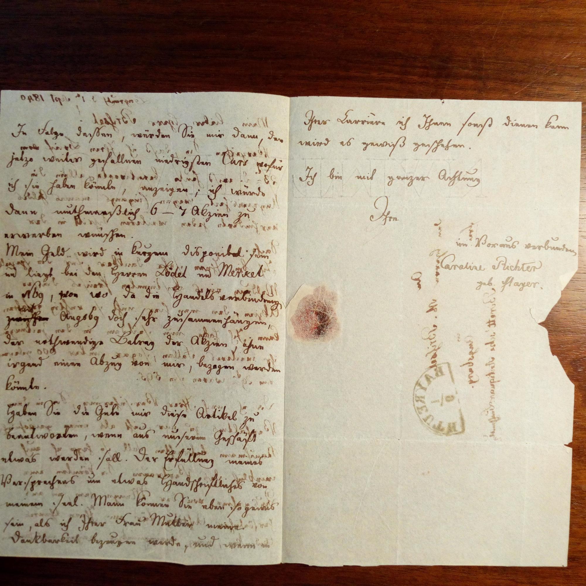 geb. Mayer, 1777-1860, Witwe des Schriftstellers Jean Paul Richter - E. Brief mit U., Bayreuth 1.9.1840, 2 ½ S. 8°, e. Anschrift, Siegel und Poststempel. An den Antiquar M. Bichsel in Augsburg mit Details zu geplanten Verkäufen: ...Der Erfüllung meines Versprechens um etwas Handschriftliches von meinem seel. Mann können Sie...gewis sein...
