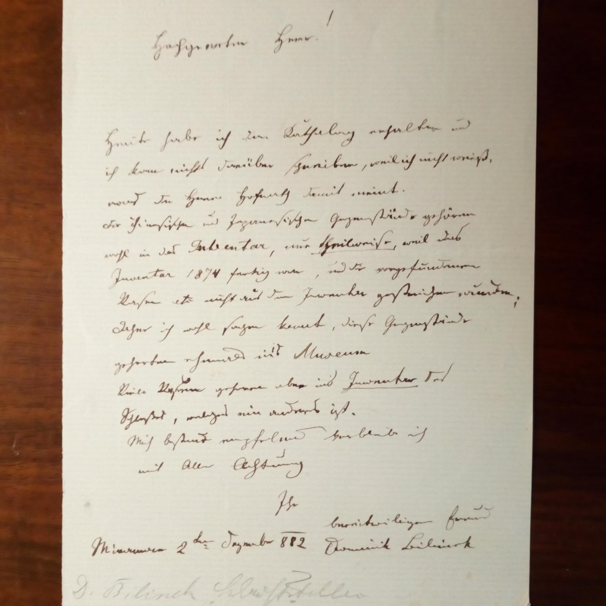 geb. 1813, sudetendt. Historiker - E. Brief mit U., Ort (?) und D. 2.12.1882, 1 S. 8°, kl. Schrift. Dankt für eine Sendung: ...die chinesischen und Japanesischen Gegenstände gehören wohl in das Inventar...Daher ich wohl sagen kennt, diese Gegenstände geherten ehemals in's Museum...