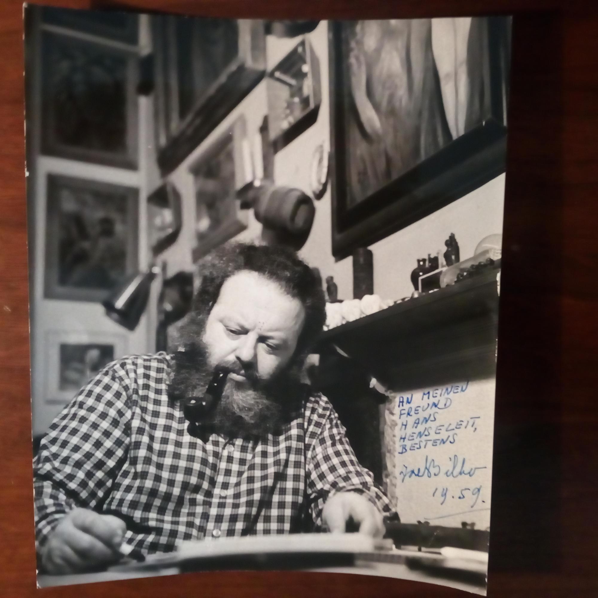 1907-67, Künstler und Bohemien in Berlin - Pfo. (ca. kl. 4°, Hochgl., beim Zeichnen) mit Widm. mit U., 1959, ger. Gebr.spuren. Für den Kieler Journalisten und Kunstsammler Hans Henseleit (1911-97).