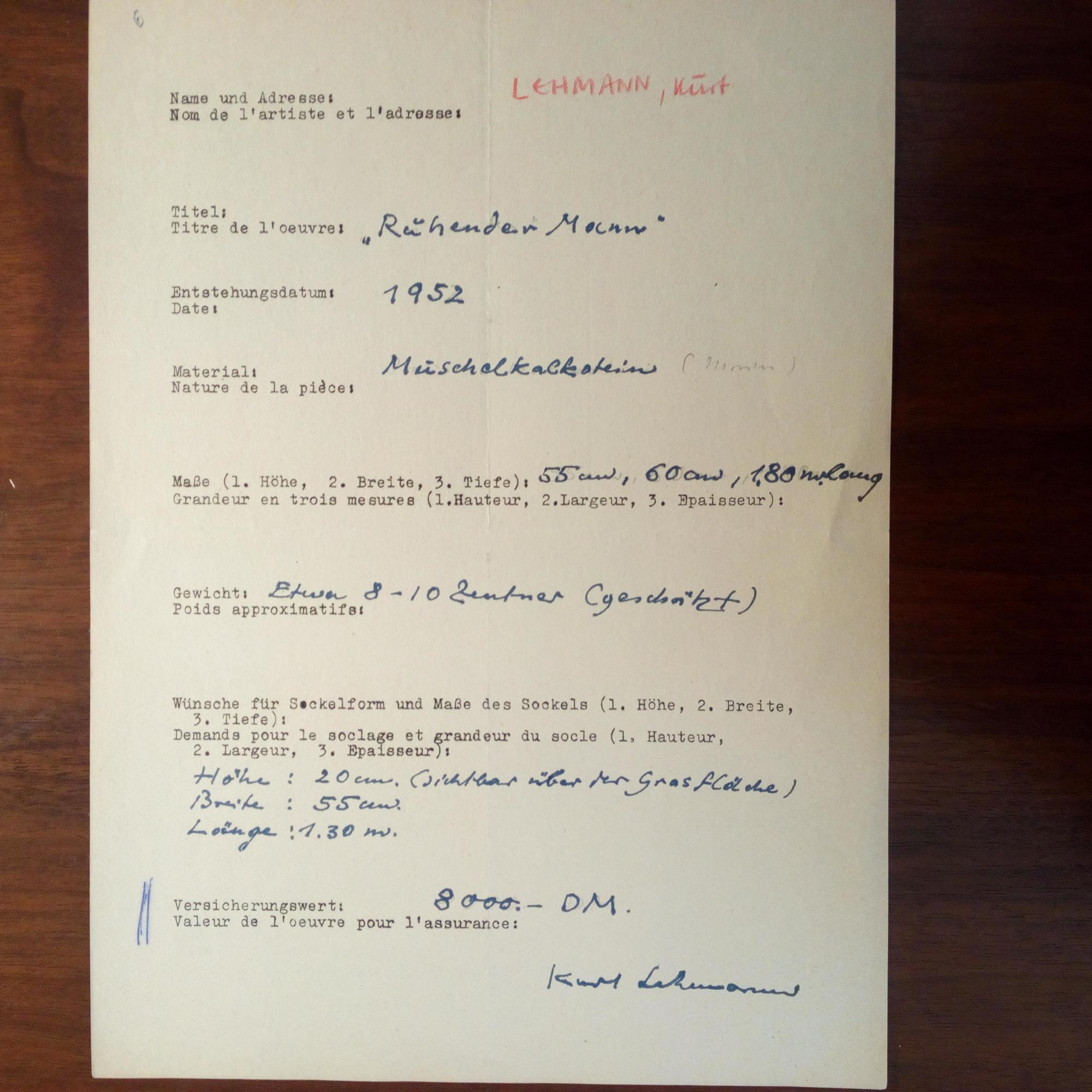 13 e. von den Künstlern ausgefüllte 4°-Anmeldebögen zur Ausstellung "Plastik 1953" in Hamburg, mit e. Mitt., Beschreibungen, Skizzen u.ä., kl. Alters- und Bearb.spuren. Davon mit U.: Ossip Zadkine, Fritz Wotruba, Germaine Richter, Toni Stadler, Kurt Lehmann, Henri Laurens. Ohne U.: Marino Marini, Hans Uhlmann, Hans Wimmer, Berto Lardera, Hans Hartung, Alberto Viani und Alexander Calder (dieser mit e. postal. Umschlag, Roxbury/Conn. 18.2.1952, Abs.stempel. An den Kunsthistoriker Werner Haftmann, 1912-99, in Hamburg).