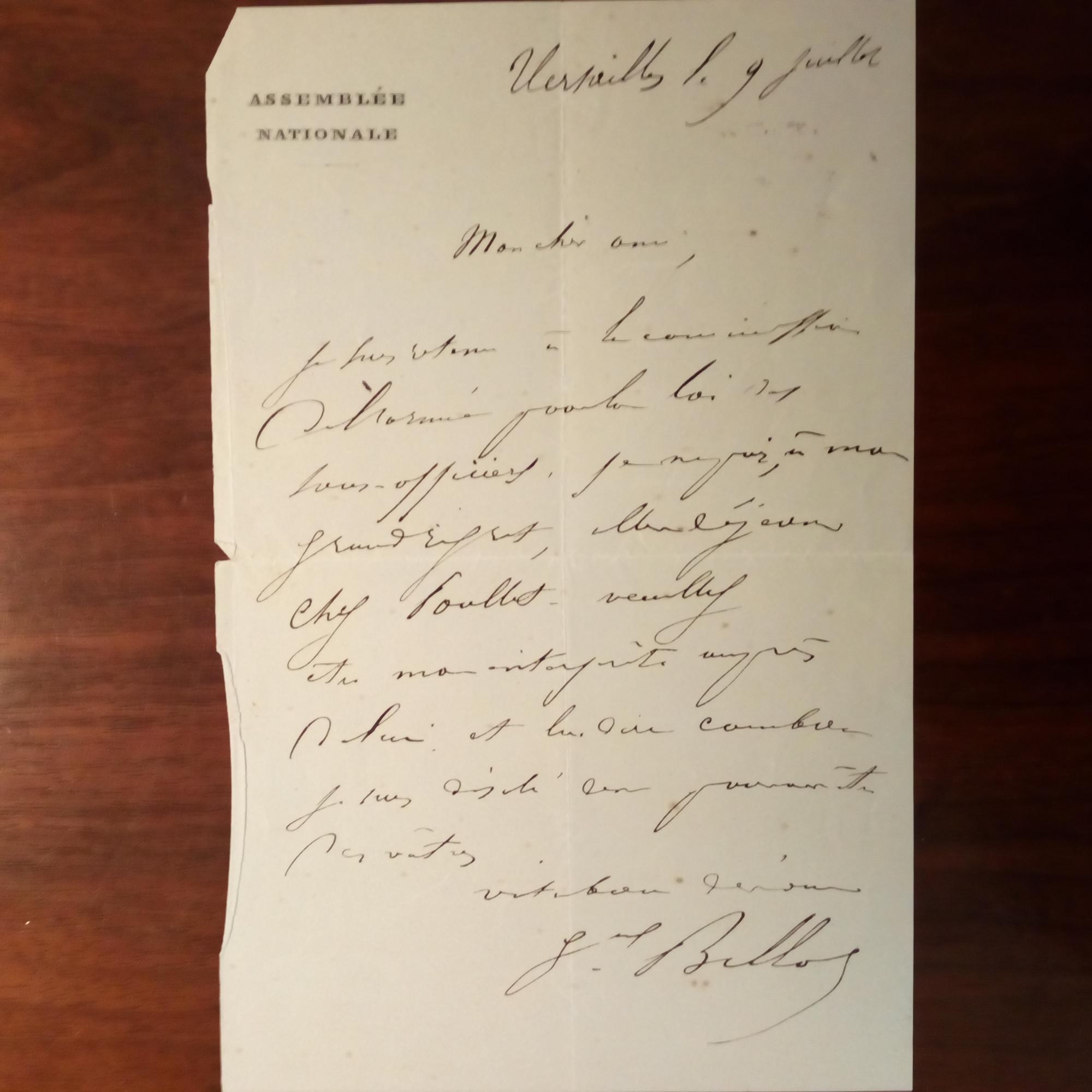 1828-1907, frz. General und Politiker, führend in der Dreyfus-Affäre - E. Brief mit U., Versailles o. J., 1 S. 8°, Br.kopf der "Assemblée Nationale", kl. Gebr.spuren. Teilt Termine mit.