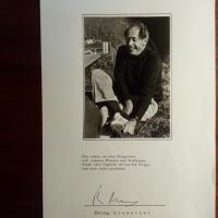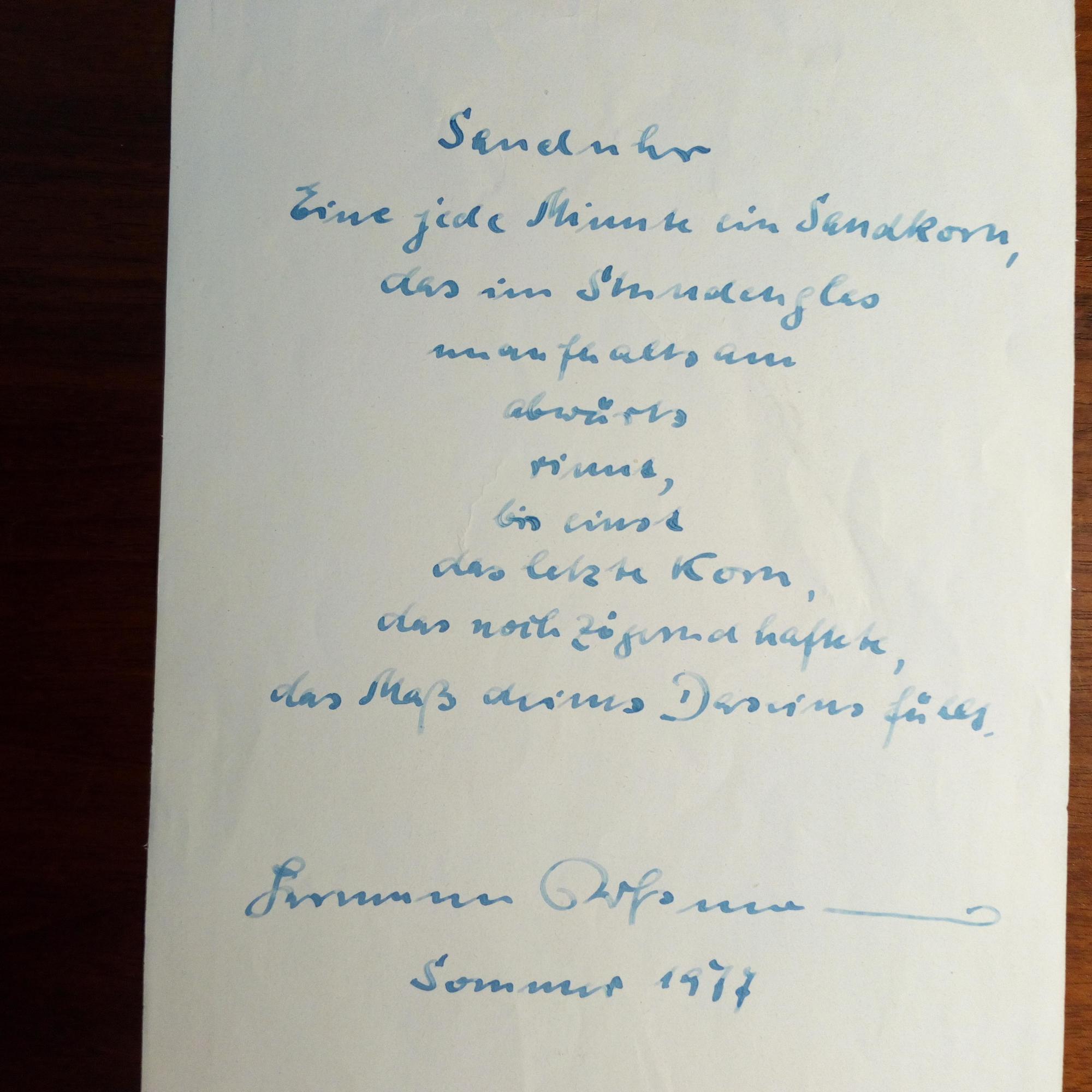1902-85, Schriftsteller - 8°-Blatt mit e. Gedicht ("Sanduhr", 9 Z. in Sanduhr-Form geschrieben) mit U. und D. Sommer 1977. Beiliegt kl. Biographie-Blatt mit Pfo.