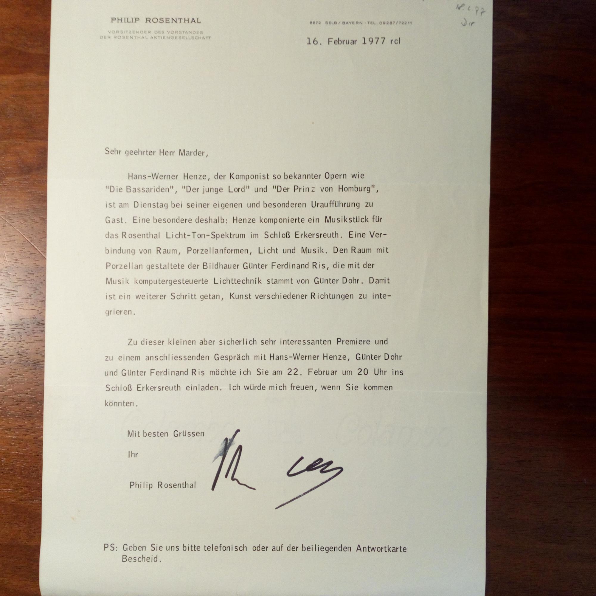1916-2001, Industrieller, SPD-Politiker u. Mäzen - Br. m. U., (Selb) 16.2.1977, 1 S. 4°, Br.kopf. Lädt Marder zum "Licht-Ton-Spektrum" von und mit dem Komponisten Hans-Werner Henze auf seinem Schloss Erkersreuth ein. Beiliegen 2 Pfo., je m. U. auf Rücks.