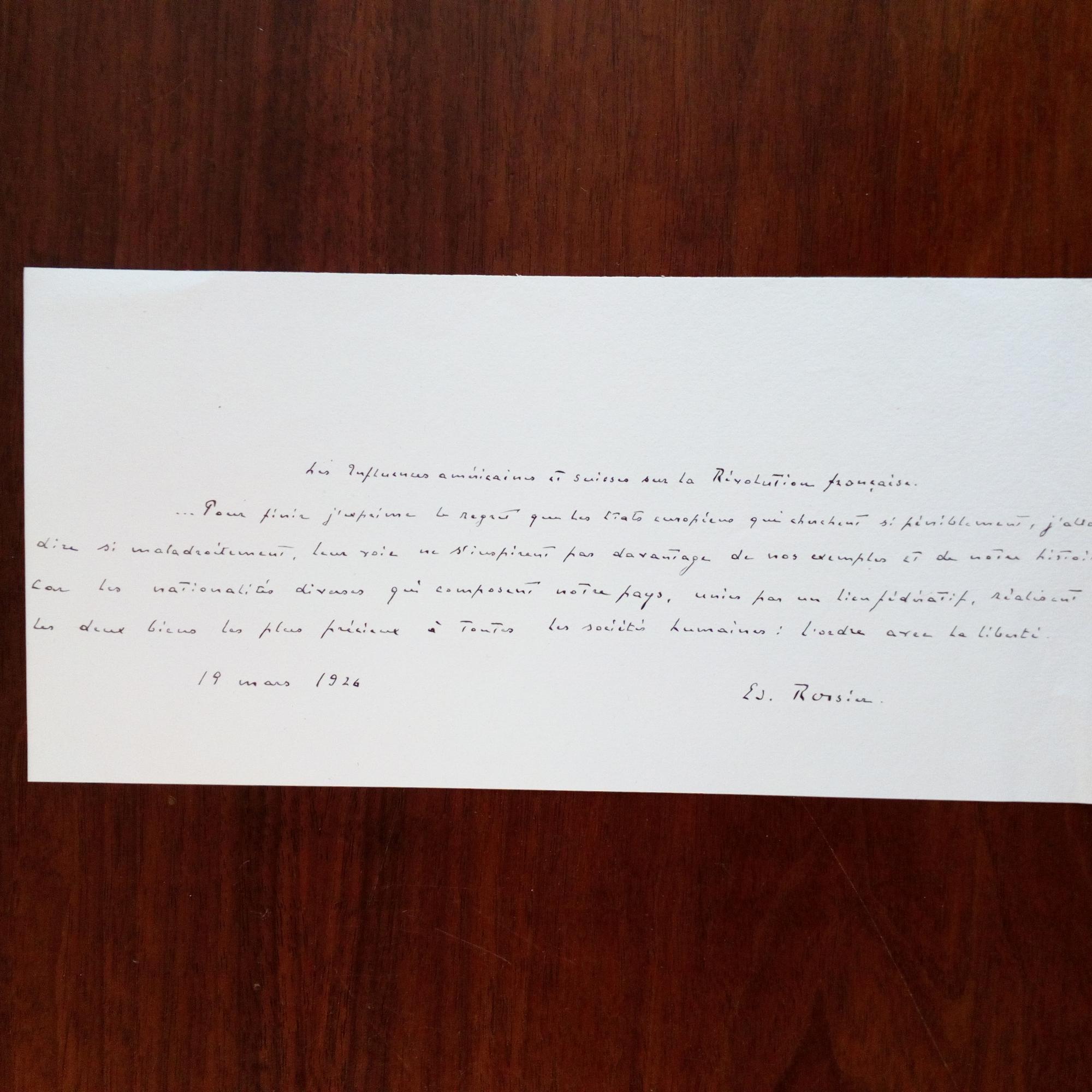 1865-1945, schweiz. Historiker, Theologe, Kolum-nist - breites quer-Blatt m. ausführl. e. Zitat, U. u. D. 19.3.1926, kl. Schrift. Überschrift: "Les Influences américains et suisses sur la Revolution francaise".