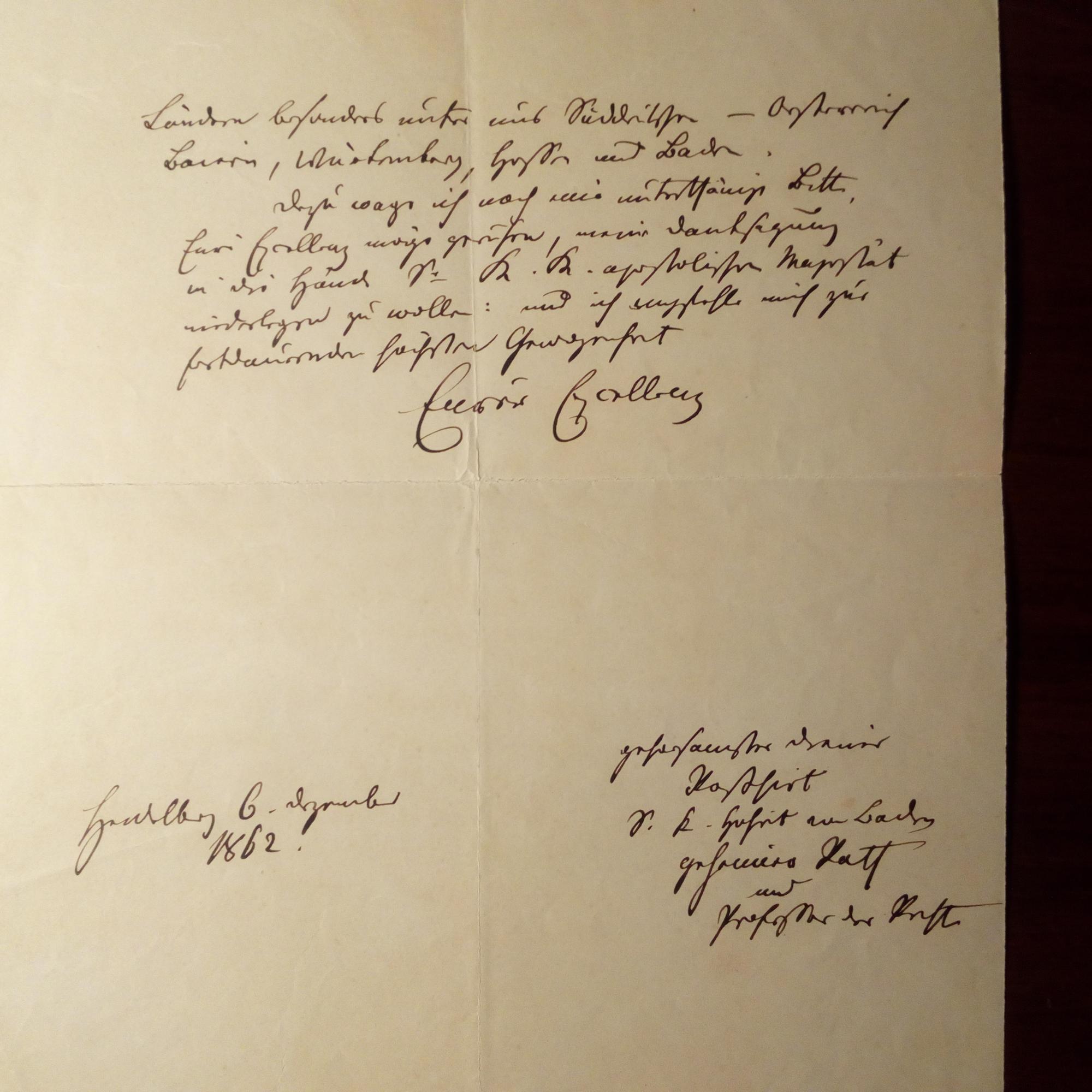 1793-1873, Jurist, Univ.direktor - E. Brief mit U., Heidelberg 6.12.1862, 1 ½ S. folio, kl. Altersspuren. Dankt Graf Reichberg ausführl. für die Protektion zur Erlangung des Franz-Joseph-Ordens.