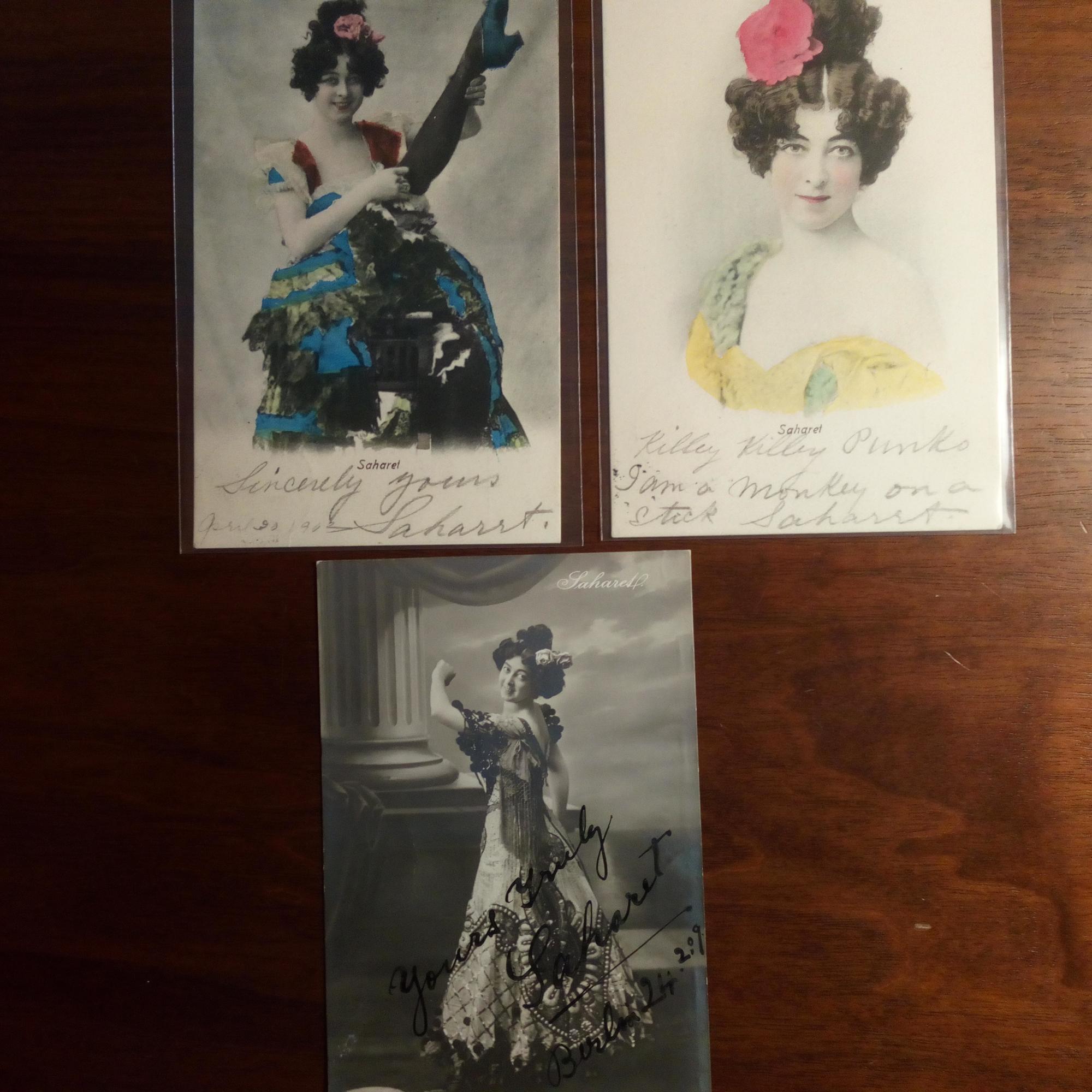 eigtl. C.R. Campell, 1879-1942, austral. Can-Can-Tänzerin, von Lenbach, Stuck u.a. gemalt - 2 Pfo. (nachkolorierte Fotogravuren), eines mit E., U. und D. 30.4.1902, eines mit e. Zitat ("Killy Killy Punko/ I am a monkey on a stick") und U., beide Bleistift. Lt. Notiz im "Orpheum" in Frankfurt. Als postal. Postkarten (beide dasselbe Datum).