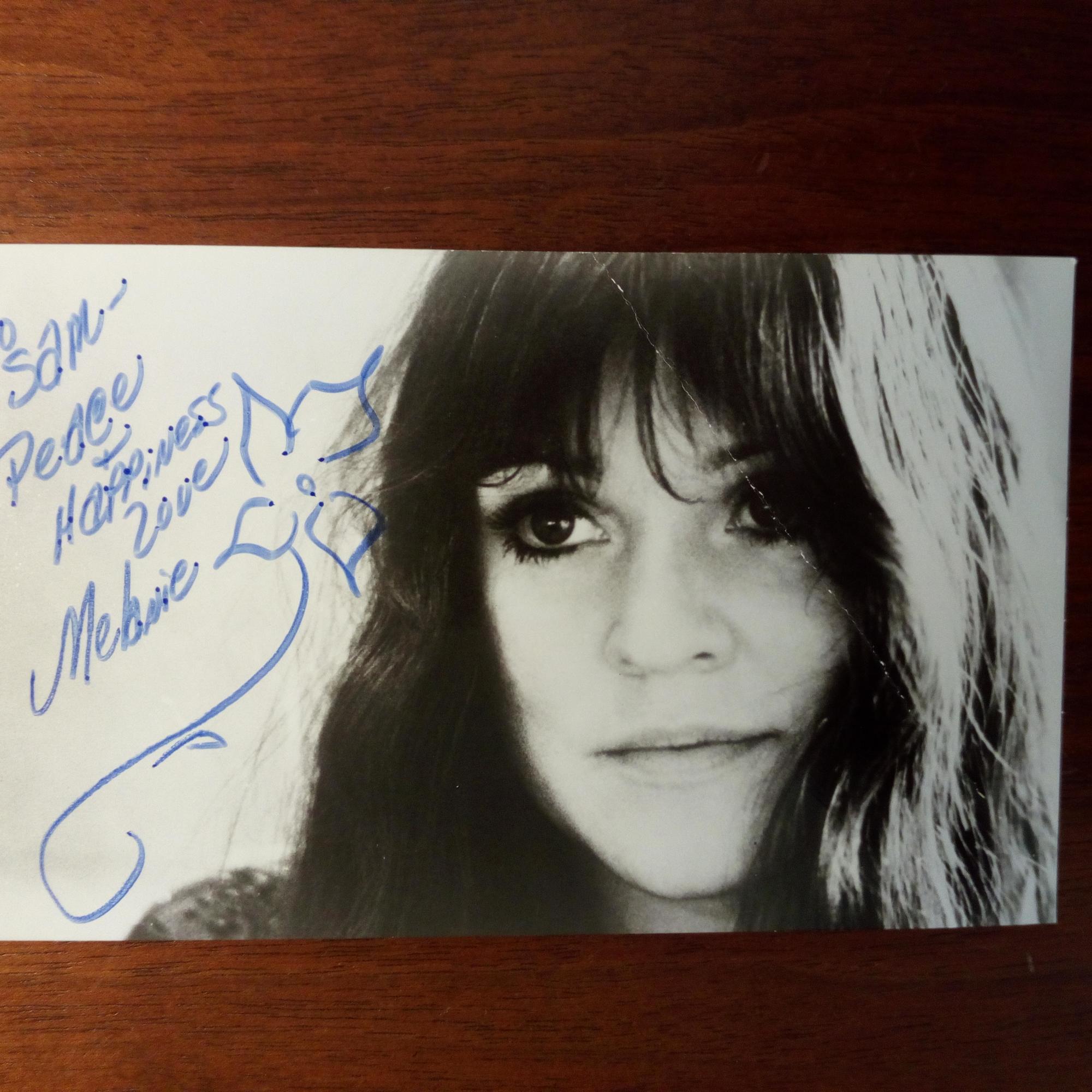 1947-2024, US-Folk-Sängerin - Kl. Pfo. (quer, mit Knick, um 1970) mit Widm., U. und e. Blume.