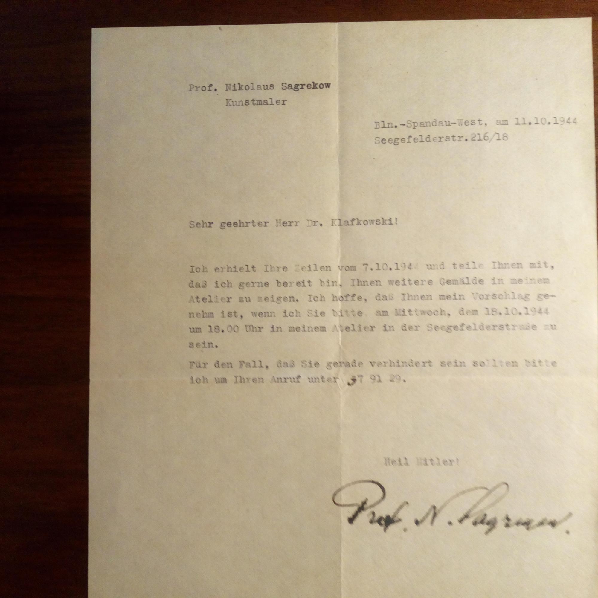 1897-1992, Maler und Graphiker russ. Herkunft - Br. m. U., Berlin-Spandau 11.10.1944, ¾ S. 4°, m. postal. Umschlag. An den Kunsthändler Klafkofski in Bernau b. Berlin: ...daß ich gerne bereit bin, Ihnen weitere Gemälde in meinem Atelier zu zeigen...